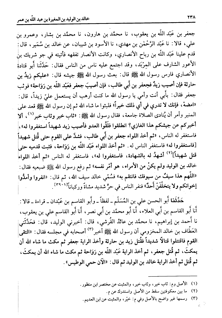 جعفر بن عبد الله بن يعقوب نا محمد بن هارون نا محمد بن بشار وعمرو بن علي قالا نا عبد الرحمن بن مهدي نا الأسود بن شيبان عن خالد بن سمير قال قدم علينا عبد الله بن رباح الأنصاري وكانت الأنصار تفقهه فأتيته في جو شريك بن الأعور الشارف على المربد وقد اجتمع عليه ناس من الناس فقال حدثنا أبو قتادة الأنصاري فارس رسول الله (صلى الله عليه وسلم) قال بعث رسول الله (صلى الله عليه وسلم) جيشه قال عليكم زيد بن حارثة فإن أصيب زيد فجعفر بن أبي طالب فإن أصيب جعفر فعبد الله بن رواحة فوثب جعفر فقال بأبي أنت وأمي يا رسول الله ما كنت أرهب أن يستعمل علي زيدا قال امضه فإنك لا تدري في أي ذلك خيرا فلبثوا ما شاء الله ثم إن رسول الله (صلى الله عليه وسلم) قعد على المنبر وأمر أن ينادى الصلاة جامعة فقال رسول الله (صلى الله عليه وسلم) ثاب خبر وثاب خبر (1) ألا أخبركم عن جيشكم هذا الغازي انطلقوا فلقوا العدو فأصيب زيد شهيدا استغفروا له فاستغفر له الناس ثم اخذ اللواء جعفر بن أبي طالب فشد على القوم حتى قتل شهيدا فاستغفروا له فاستغفر الناس له ثم أخذ اللواء عبد الله بن رواحة فثبت قدميه حتى قتل شهيدا (2) أشهد له بالشهادة فاستغفروا له فاستغفر له الناس ثم أخذ اللواء خالد بن الوليد ولم يكن من الأمراء هو أمر نفسه ثم رفع رسول الله (صلى الله عليه وسلم) ضبعيه فقال اللهم هذا سيف من سيوفك فانتقم به فسمي خالد سيف الله ثم قال انفروا وأمدوا إخوانكم ولا يتخلفن أحد فنفر الناس في حر شديد مشاة وركبانا حدثنا أبو الحسن علي بن المسلم لفظا وأبو القاسم بن عبدان قراءة قالا أنا أبو القاسم بن أبي العلاء أنا أبو محمد بن أبي نصر أنا أبو القاسم علي بن يعقوب نا أحمد بن إبراهيم نا محمد بن عائذ القرشي قال أخبرني الوليد قال فحدثني العطاف بن خالد المخزومي أن رسول الله (صلى الله عليه وسلم) أخبر (3) أصحابه في مجلسه فقال التقى القوم فاقتتلوا قتالا شديدا فقتل زيد بن حارثة وأخذ الراية جعفر ثم مكث ما شاء الله أن يمكث ثم قتل جعفر ثم أخذ الراية عبد الله بن رواحة ثم مكث ما شاء الله أن يمكث ثم قتل ثم أخذ الراية خالد بن الوليد ثم قال الآن حمي الوطيس