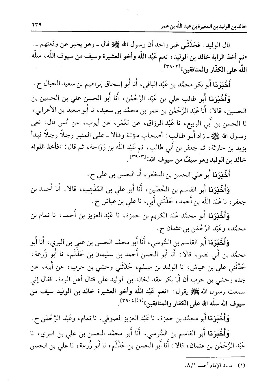 الحسين قالا أنا عبد الرحمن بن عمر بن محمد بن سعيد نا أبو سعيد بن الأعرابي نا الحسن بن أبي الربيع نا عبد الرزاق عن معمر عن أيوب عن أنس قال نعى رسول الله (صلى الله عليه وسلم) زاد أبو طالب أصحاب مؤتة وقالا على المنبر رجلا رجلا فبدأ بزيد بن حارثة ثم جعفر بن أبي طالب ثم عبد الله بن رواحة ثم قال فأخذ اللواء خالد بن الوليد وهو سيف من سيوف الله أخبرنا أبو علي الحسن بن المظفر أنا الحسن بن علي وأخبرنا أبو القاسم بن الحصين أنا أبو علي بن المذهب قالا أنا أحمد بن جعفر نا عبد الله بن أحمد حدثني أبي نا علي بن عياش وأخبرنا أبو محمد عبد الكريم بن حمزة نا عبد العزيز بن أحمد نا تمام بن محمد وعبد الرحمن بن عثمان وأخبرنا أبو القاسم بن السوسي أنا أبو محمد الحسن بن علي بن البري أنا أبو محمد بن أبي نصر قالا أنا أبو الحسن أحمد بن سليمان بن حذلم نا أبو زرعة حدثني علي بن عياش نا الوليد بن مسلم حدثني وحشي بن حرب عن أبيه عن جده وحشي بن حرب أن أبا بكر عقد لخالد بن الوليد على قتال أهل الردة فقال إني سمعت رسول الله (صلى الله عليه وسلم) يقول نعم عبد الله وأخو العشيرة خالد بن الوليد سيف من سيوف الله سله الله على الكفار والمنافقين (1) وأخبرنا أبو محمد بن حمزة نا عبد العزيز الصوفي نا تمام وعبد الرحمن وأخبرنا أبو القاسم بن السوسي أنا أبو محمد الحسن بن علي بن البري نا عبد الرحمن بن عثمان قالا أنا أبو الحسن بن حذلم نا أبو زرعة نا علي بن الحسن