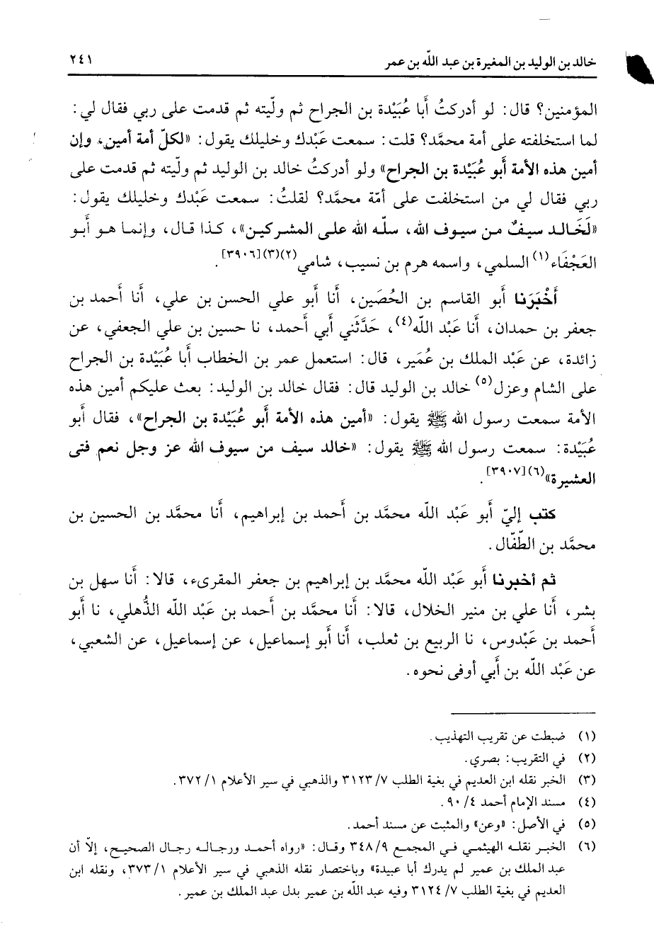 الأمة سمعت رسول الله (صلى الله عليه وسلم) يقول أمين هذه الأمة أبو عبيدة بن الجراح فقال أبو عبيدة سمعت رسول الله (صلى الله عليه وسلم) يقول خالد سيف من سيوف الله عز وجل نعم فتى العشيرة (6) كتب إلي أبو عبد الله محمد بن أحمد بن إبراهيم أنا محمد بن الحسين بن محمد بن الطفال ثم أخبرنا أبو عبد الله محمد بن إبراهيم بن جعفر المقرئ قالا أنا سهل بن بشر أنا علي بن منير الخلال قالا أنا محمد بن أحمد بن عبد الله الذهلي نا أبو أحمد بن عبدوس نا الربيع بن ثعلب أنا أبو إسماعيل عن إسماعيل عن الشعبي عن عبد الله بن أبي أوفى نحوه