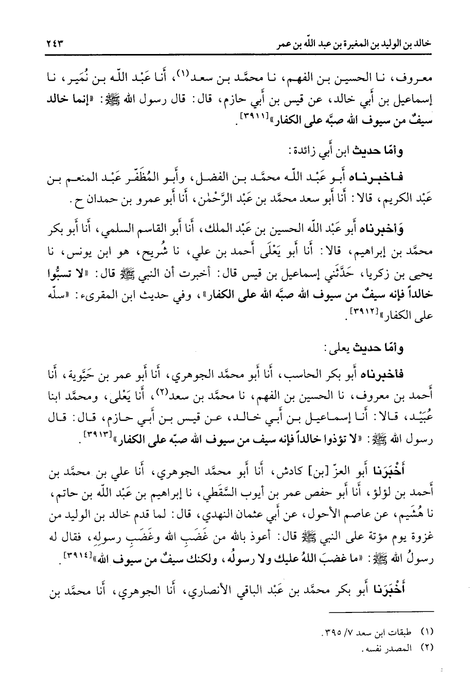 معروف نا الحسين بن الفهم نا محمد بن سعد (1) أنا عبد الله بن نمير نا إسماعيل بن أبي خالد عن قيس بن أبي حازم قال قال رسول الله (صلى الله عليه وسلم) إنما خالد سيف من سيوف الله صبه على الكفار وأما حديث ابن أبي زائدة فأخبرناه أبو عبد الله محمد بن الفضل وأبو المظفر عبد المنعم بن عبد الكريم قالا أنا أبو سعد محمد بن عبد الرحمن أنا أبو عمرو بن حمدان وأخبرناه أبو عبد الله الحسين بن عبد الملك أنا أبو القاسم السلمي أنا أبو بكر محمد بن إبراهيم قالا أنا أبو يعلى أحمد بن علي نا شريح هو ابن يونس نا يحيى بن زكريا حدثني إسماعيل بن قيس قال أخبرت أن النبي (صلى الله عليه وسلم) قال لا تسبوا خالدا فإنه سيف من سيوف الله صبه الله على الكفار وفي حديث ابن المقرئ سله على الكفار وأما حديث يعلى فأخبرناه أبو بكر الحاسب أنا أبو محمد الجوهري أنا أبو عمر بن حيوية أنا أحمد بن معروف نا الحسين بن فهم نا محمد بن سعد (2) أنا يعلى ومحمد ابنا عبيد قالا أنا إسماعيل بن أبي خالد عن قيس بن أبي حازم قال قال رسول الله (صلى الله عليه وسلم) لا تؤذوا خالدا فإنه سيف من سيوف الله صبه على الكفار ح أخبرنا أبو العز بن كادش أنا أبو مح حمد الجوهري أنا علي بن محمد بن أحمد بن لؤلؤ أنا أبو حفص عمر بن أيوب السقطي نا إبراهيم بن عبد الله بن حاتم نا هشيم عن عاصم الأحول عن أبي عثمان النهدي قال لما قدم خالد بن الوليد من غزوة يوم مؤتة على النبي (صلى الله عليه وسلم) قال أعوذ بالله من غضب الله وغضب رسوله فقال له رسول الله (صلى الله عليه وسلم) ما غضب الله عليك ولا رسوله ولكنك سيف من سيوف الله أخبرنا أبو بكر محمد بن عبد الباقي الأنصاري أنا الجوهري أنا محمد بن