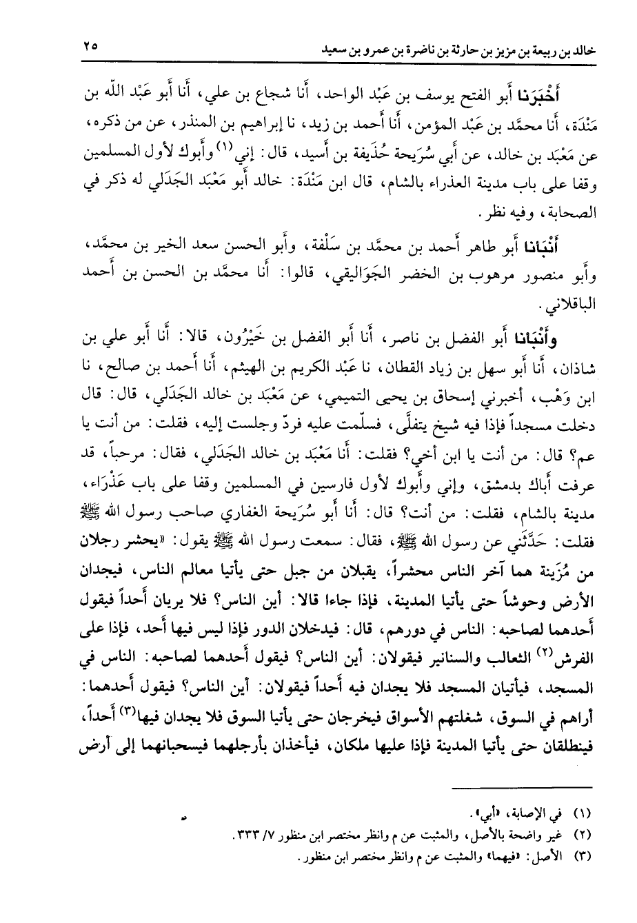 أخبرنا أبو الفتح يوسف بن عبد الواحد أنا شجاع بن علي أنا أبو عبد الله بن مندة أنا محمد بن عبد المؤمن أنا أحمد بن زيد نا إبراهيم بن المنذر عن من ذكره عن معبد بن خالد عن أبي سريحة حذيفة بن أسيد قال إني (1) وأبوك لأول المسلمين وقفا على باب مدينة العذراء بالشام قال ابن مندة خالد أبو معبد الجدلي له ذكر في الصحابة وفيه نظر أنبأنا أبو طاهر أحمد بن محمد بن سلفة وأبو الحسن سعد الخير بن محمد وأبو منصور مرهوب بن الخضر الجواليقي قالوا أنا محمد بن الحسن بن أحمد الباقلاني وأنبأنا أبو الفضل بن ناصر أنا أبو الفضل بن خيرون قالا أنا أبو علي بن شاذان أبو سهل بن زياد القطان نا عبد الكريم بن الهيثم أنا أحمد بن صالح نا ابن وهب أخبرني إسحاق بن يحيى التميمي عن معبد بن خالد الجدلي قال قال دخلت مسجدا فإذا فيه شيخ يتفلى فسلمت عليه فرد وجلست إليه فقلت من أنت يا