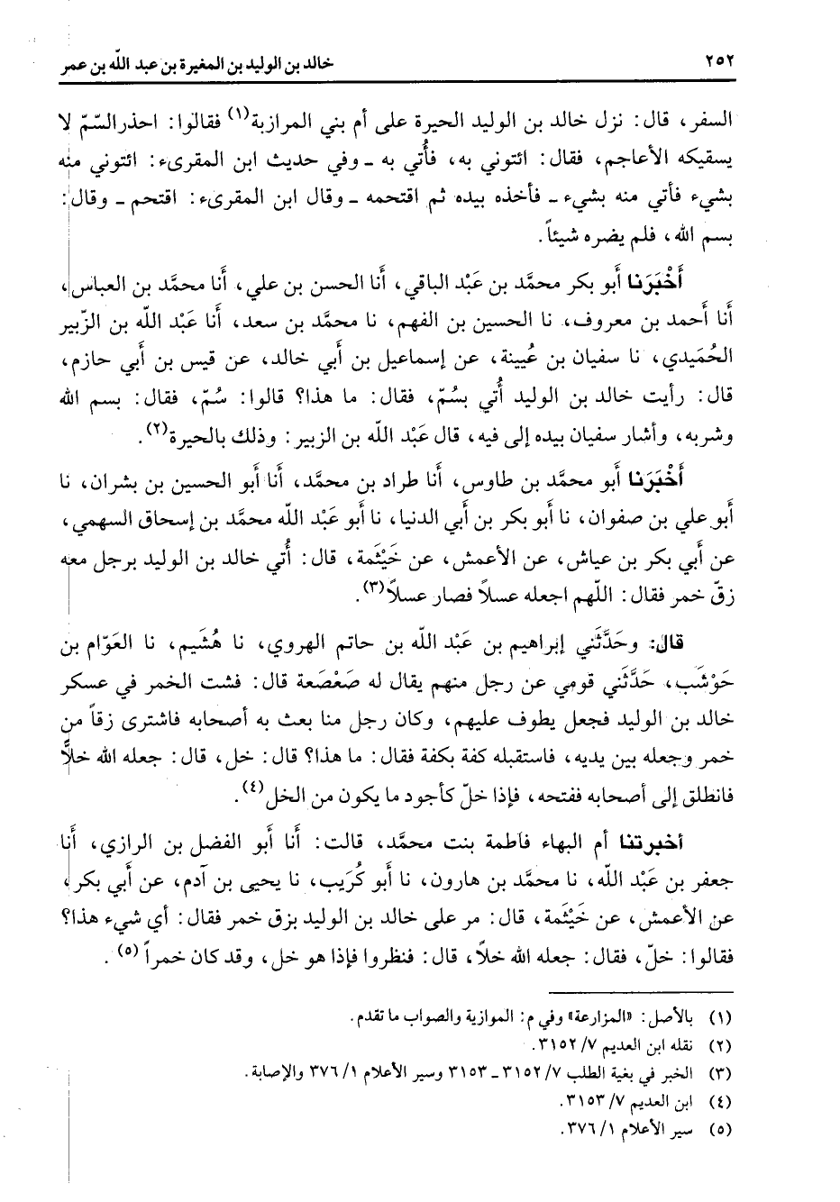 السفر قال نزل خالد بن الوليد الحيرة على أم بني المرازبة (1) فقالوا احذر السم لا يسقيكه الأعاجم فقال ائتوني به فأتي به وفي حديث ابن المقرئ ائتوني منه بشئ فأتيمنه بشئ فأخذه بيده ثم اقتحمه وقال ابن المقرئ اقتحم وقال بسم الله فلم يضره شيئا أخبرنا أبو بكر محمد بن عبد الباقي أنا الحسن بن علي أنا محمد بن العباس أنا أحمد بن معروف نا الحسين بن الفهم نا محمد بن سعد أنا عبد الله بن الزبير الحميدي نا سفيان بن عيينة عن إسماعيل بن أبي خالد عن قيس بن أبي حازم قال رأيت خالد بن الوليد أتي بسم فقال ما هذا قالوا سم فقال بسم الله وشربه وأشار سفيان بيده إلى فيه قال عبد الله بن الزبير وذلك بالحيرة (2) أخبرنا أبو محمد بن طاوس أنا طراد بن محمد أنا أبو الحسين بن بشران نا أبو علي بن صفوان نا أبو بكر بن أبي الدنيا نا أبو عبد الله محمد بن إسحاق السهمي عن أبي بكر بن عياش عن الأعمش عن خيثمة قال أتي خالد بن الوليد برجل معه زق خمر فقال اللهم اجعله عسلا فصار عسلا (3) قال وحدثني إبراهيم بن عبد الله بن حاتم الهروي نا هشيم نا العوام بن حوشب حدثني قومي عن رجل منهم يقال له صعصعة قال فشت الخمر في عسكر خالد بن الوليد فجعل يطوف عليهم وكان رجل منا بعث به أصحابه فاشترى زقا من خمر وجعله بين يديه فاستقبله كفة بكفة فقال ما هذا قال خل قال جعله الله خلا فانطلق إلى أصحابه ففتحه فإذا خل كأجود ما يكون من الخل (4) أخبرتنا أم البهاء فاطمة بنت محمد قالت أنا أبو الفضل بن الرازي أنا جعفر بن عبد الله نا محمد بن هارون نا أبو كريب نا يحيى بن آدم عن أبي بكر عن الأعمش عن خيثمة قال مر على خالد بن الوليد بزق خمر فقال أي شئ هذا فقالوا خل فقال جعله الله خلا قال فنظروا فإذا هو خل وقد كان خمرا (5)