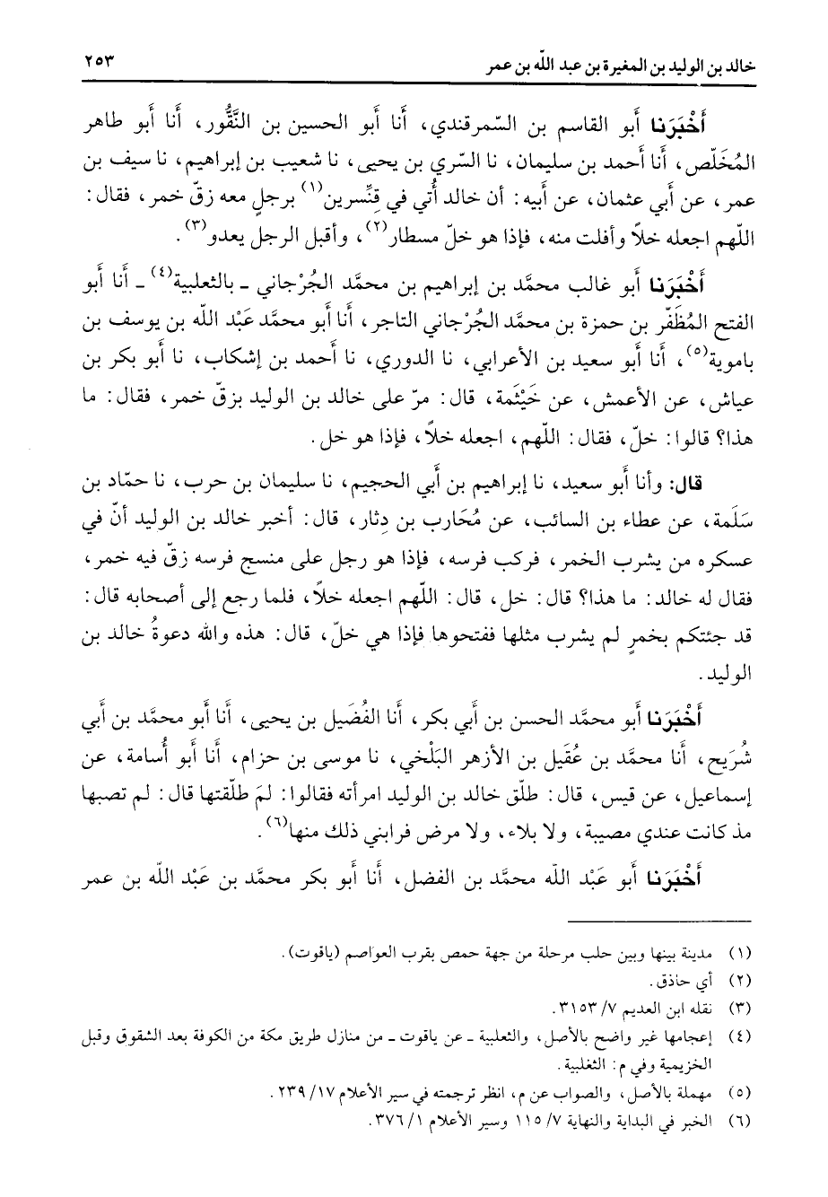 أخبرنا أبو القاسم بن السمرقندي أنا أبو الحسين بن النقور أنا أبو طاهر المخلص أنا أحمد بن سليمان نا السري بن يحيى نا شعيب بن إبراهيم نا سيف بن عمر عن أبي عثمان عن أبيه أن خالد أتي في قنسرين (1) برجل معه زق خمر فقال اللهم اجعله خلا وأفلت منه فإذا هو خل مسطار (2) وأقبل الرجل يعدو (3) أخبرنا أبو غالب محمد بن إبراهيم بن محمد الجرجاني بالثعلبية (4) أنا أبو الفتح المظفر بن محمد الجرجاني التاجر أنا أبو محمد عبد الله بن يوسف بن باموية (5) أنا أبو سعيد بن الأعرابي نا الدوري نا أحمد بن إشكاب نا أبو بكر بن عياش عن الأعمش عن خيثمة قال مر على خالد بن الوليد بزق خمر فقال ما هذا قالوا خل فقال اللهم اجعله خلا فإذا هو خل قال وأنا أبو سعيد نا إبراهيم بن أبي الحجيم نا سليمان بن حرب نا حماد بن سلمة عن عطاء بن السائب عن محارب بن دثار قال أخبر خالد بن الوليد أن في عسكره من يشرب الخمر فركب فرسه فإذا هو رجل على منسج فرسه زق فيه خمر فقال له خالد ما هذا قال خل قال اللهم اجعله خلا فلما رجع إلى أصحابه قال قد جئتكم بخمر لم يشرب مثلها ففتحوها فإذا هي خل قال هذه والله دعوة خالد بن الوليد أخبرنا أبو محمد الحسن بن أبي بكر أنا الفضيل بن يحيى أنا أبو محمد بن أبي شريح أنا محمد بن عقيل بن الأزهر البلخي نا موسى بن حزام أنا أبو أسامة عن إسماعيل عن قيس قال طلق خالد بن الوليد امرأته فقالوا لم طلقتها قال لم تصبها مذ كانت عندي مصيبة ولا بلاء ولا مرض فرابني ذلك منها (6) أخبرنا أبو عبد الله محمد بن الفضل أنا أبو بكر محمد بن عبد الله بن عمر