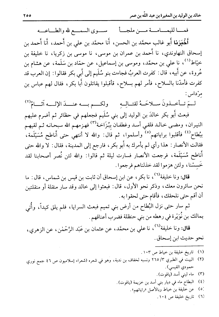 فما لليمامة من ملجأ * سوى السمع لله والطاعه * أخبرنا أبو غالب محمد بن الحسن أنا محمد بن علي بن أحمد أنا أحمد بن إسحاق النهاوندي نا أحمد بن عمران بن موسى نا موسى بن زكريا نا خليفة بن خياط (1) نا علي بن محمد وموسى بن إسماعيل عن حماد بن سلمة عن هشام بن عروة عن أبيه قال كفرت العرب فجاءت بنو سليم إلى أبي بكر فقالوا إن العرب قد كفرت فأمدنا بالسلاح فأمر لهم بسلاح فأقبلوا يقاتلون أبا بكر فقال لهم عباس بن مرداس لم تأخذون سلاحه لقتاله * ولكم به عند الإله آثام (2) فبعث أبو بكر خالد بن الوليد إلى بني سليم فجعلهم في حظائر ثم أضرم عليهم النيران ومضى خالد فلقي أسد وغطفان ببزاخة (3) فهزمهم الله سبحانه ثم لقيهم ببطاح (4) فأقبلوا براياتهم (5) وأسلموا ثم قال والله لا انتهي حتى أناطح مسيلمة فقالت الأنصار هذا رأي لم يأمرك به أبو بكر فارجع إلى المدينة فقال لا والله حتى أناطح مسيلمة فرجعت الأنصار فسارت ليلة ثم قالوا والله لئن نصر أصحابنا لقد خسسنا ولئن هزموا لقد خذلناهم فرجعوا قال ونا خليفة (6) نا بكر عن ابن إسحاق أن ثابت بن قيس بن شماس قال ما نحن سائرون معك وذكر نحو الأول قال فبعثوا إلى خالد وقد سار منقلة أو منقلتين أن أقم حتى نلحقك فأقام حتى لحقوا به ثم سار حتى نزل البطاح من أرض بني تميم فبعث السرايا فلم يلق كيدا وأتي بمالك بن نويرة في رهطه من بني حنظلة فضرب أعناقهم قال ونا خليفة نا علي بن محمد عن عثمان بن عبد الرحمن عن الزهري نحو حديث ابن إسحاق