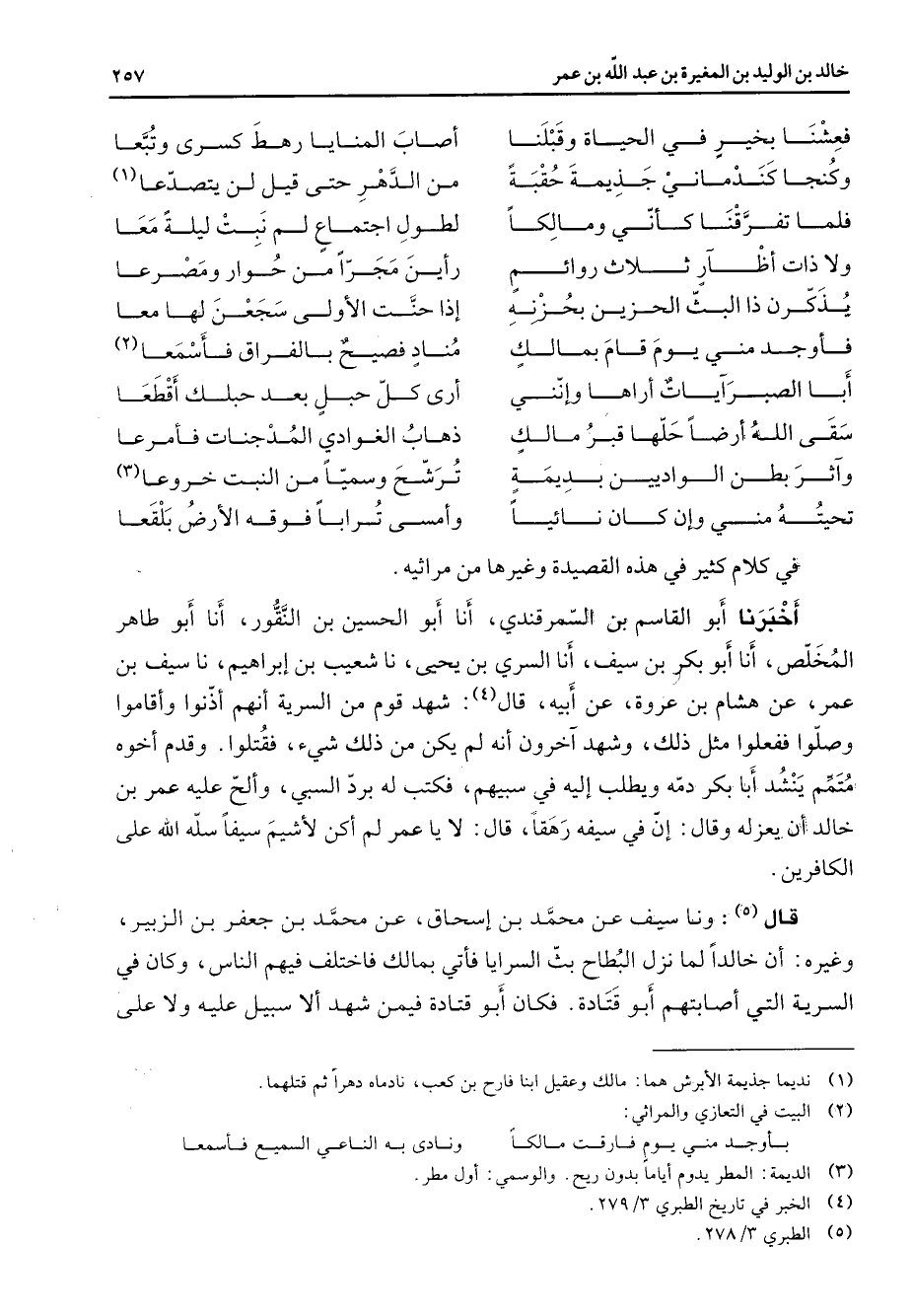 فعشنا بخير في الحياة وقبلنا * أصاب المنايا رهط كسرى وتبعا وكنجا كندماني جذيمة حقبة * من الدهر حتى قيل لن يتصدعا (1) فلما تفرقنا كأني ومالكا * لطول اجتماع لم نبت ليلة معا ولا ذات أظآر ثلاث روائم * رأين مجرا من حوار ومصرعا * يذكرن ذا البث الحزين بحزنه * إذا حنت الأولى سجعن لها معا * فأوجد مني يوم قام بمالك * مناد فصيح بالفراق فأسمعا (2) أبا الصبرآيات أراها وإنني * أرى كل حبل بعد حبلك أقطعا سقى الله أرضا حلها قبر مالك * ذهاب الغوادي المدجنات فأمرعا وآثر بطن الواديين بديمة * ترشح وسميا من النبت خروعا (3) تحيته مني وإن كان نائيا * وأمسى ترابا فوقه الأرض بلقعا * في كلام كثير في هذه القصيدة وغيرها من مراثيه أخبرنا أبو القاسم بن السمرقندي أنا أبو الحسين بن النقور أنا أبو طاهر المخلص أنا أبو بكر بن سيف أنا السري ين يحيى نا شعيب بن إبراهيم نا سيف بن عمر عن هشام بن عروة عن أبيه قال (4) شهد قوم من السرية أنهم أذنوا وأقاموا وصلوا ففعلوا مثل ذلك وشهد آخرون أنه لم يكن من ذلك شئ فقتلوا وقدم أخوه متمم ينشد أبا بكر دمه ويطلب إليه في سبيهم فكتب له برد السبي وألح عليه عمر بن خالد أن يعزله وقال إن في سيفه رهقا قال لا يا عمر لم أكن لأشيم سيفا سله الله على الكافرين قال (5) ونا سيف عن محمد بن إسحاق عن محمد بن جعفر بن الزبير وغيره أن خالدا لما نزل البطاح بث السرايا فأتي بمالك فاختلف فيهم الناس وكان في السرية التي أصابتهم أبو قتادة فكان أبو قتادة فيمن شهد ألا سبيل عليه ولا على