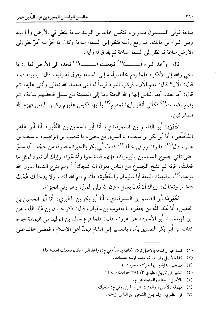 ساعة فولى المسلمون مدبرين فنكس خالد بن الوليد ساعة ينظر في الأرض وأنا بينه وبين البراء بن مالك ثم رفع رأسه فنظر إلى السماء ساعة وكان إذا حز به أمر نظر إلى الأرض ساعة ثم نظر إلى السماء ساعة ثم يفرق له رأيه قال وأخذ البراء (1) فجعلت (2) فخذه إلى الأرض فقال يا أخي والله إني لأفكر فلما رفع خالد رأسه إلى السماء وفرق له رأيه قال يا براء قم قال الآن قال نعم الآن فركب البراء فرسا له أنثى فحمد الله تعالى وأثنى عليه ثم قال أما بعد أيها الناس إنها والله الجنة وما إلى المدينة من سبيل فحضهم ساعة ثم بضع بضعات (2) فكأني أنظر إليها تمصع (3) بذنبها فكبس عليهم وكبس الناس فهزم الله المشركين أخبرنا أبو القاسم بن السمرقندي أنا أبو الحسين بن النقور أنا أبو طاهر المخلص أنا أبو بكر بن سيف نا السري بن يحيى نا شعيب بن إبراهيم نا سيف بن عمر قال (4) قالوا ووافى خالدا (5) كتاب أبي بكر بالحيرة منصرفه من حجه أن سر حتى تأتي جموع المسلمين باليرموك فإنهم قد شجوا وأشجوا وإياك أن تعود لمثل ما فعلت فإنه لم تشج الجموع من الناس بعون الله شجاك (6) ولم ينزع الشجا بعون الله نزعك (7) وليهنك البيعة أبا سليمان والحظوة فأتمم يتم الله لك ولا يدخلنك عجب فتخسر وتخذل وإياك أن تدل بعمل فإن الله ولي المن وهو ولي الجزاء أخبرنا أبو القاسم بن السمرقندي أنا أبو بكر بن الطبري أنا أبو الحسين بن الفضل أنا عبد الله بن جعفر نا يعقوب بن سفيان قال ذكر حسان بن عبد الله عن أبي لهيعة نا أبو الأسود عن عروة قال فلما فرغ خالد بن الوليد من اليمامة جاءه كتاب من ابن بكر الصديق يأمره بالمسير إلى الشام فيمد أهل الإسلام فمضى خالد على