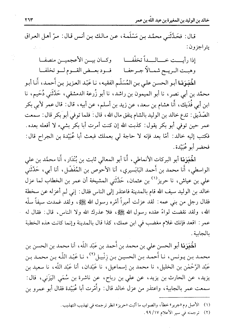 قال فحدثني محمد بن مسلمة عن مالك بن أنس قال مر أهل العراق يتراجزون * إذا رأيت خالدا تخففا * وكان بين الأعجمين منصفا وهبت الريح شمالا جرحفا * فود بعض القوم لو تخلفا * أخبرنا أبو الحسن علي بن المسلم الفقيه نا عبد العزيز بن أحمد أنا أبو محمد بن أبي نصر نا أبو الميمون بن راشد نا أبو زرعة الدمشقي حدثني دحيم نا ابن أبي فديك أنا هشام بن سعد عن زيد بن أسلم عن أبيه قال قال عمر لأبي بكر الصديق تدع خالد بن الوليد بالشام ينفق مال الله قال فلما توفي أبو بكر قال سمعت عمر حين توفي أبو بكر يقول كذبت الله إن كنت أمرت أبا بكر بشئ لا أفعله بعده فكتب إليه خالد أما بعد فإنه لا حاجة لي بعملك فبعث أبا عبيدة بن الجراح قال فحضر أبو عبيدة أخبرنا أبو البركات الأنماطي أنا أبو المعالي ثابت بن بندار أنا محمد بن علي الواسطي أنا محمد بن أحمد البابسيري أنا الأحوص بن المفضل أنا أبي حدثني علي بن عياش نا حريز (1) بن عثمان حدثني المشيخة أن عمر بن الخطاب لما عزل خالد بن الوليد سيف الله قام بالمدينة فاعتذر إلى الناس فقال إني لم أعزله عن سخطة فقال رجل من بني عمه لقد عزلت أميرا أمره رسول الله (صلى الله عليه وسلم) ولقد غمدت سيفا سله الله ولقد نقضت لواء عقده رسول (صلى الله عليه وسلم) فلا عذرك الله ولا الناس قال فقال له عمر اقعد فإنك غلام مغضب في ابن عمك كذا قال بالمدينة وإنما كانت هذه الخطبة بالجابية أخبرنا أبو الحسن علي بن محمد بن أحمد بن عبد الله أنا محمد بن الحسن بن محمد بن يونس نا أحمد بن الحسين بن زنبيل (2) نا عبد الله بن محمد بن عبد الرحمن بن الخليل نا محمد بن إسماعيل نا عبدان أنا عبد الله نا سعيد بن يزيد عن الحارث بن يزيد عن علي بن رباح عن ناشرة بن سمي اليزني قال سمعت عمر بالجابية واعتذر من عزل خالد قال وأمرت أبا عبيدة فقال أبو عمرو بن