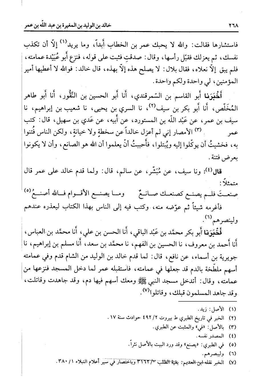 فاستشارها فقالت والله لا يحبك عمر بن الخطاب أبدا وما يريد (1) إلا أن تكذب نفسك ثم يعزلك فقبل رأسها وقال صدقت فثبت على قوله فنزع أبو عبيدة عمامته فلم يبق إلانعلاه فقال بلال لا يصلح هذه إلا بهذه قال خالد فوالله لا أعطيها أمير المؤمنين لي واحدة ولكم واحدة أخبرنا أبو القاسم بن السمرقندي أنا أبو الحسين بن النقور أنا أبو طاهر المخلص أنا أبو بكر بن سيف (2) نا السري بن يحيى نا شعيب بن إبراهيم نا سيف بن عمر عن عبد الله بن المستورد عن أبيه عن عدي بن سهيل قال كتب عمر (3) في الأمصار إني لم أعزل خالدا عن سخطة ولا خيانة ولكن الناس فتنوا به فخشيت أن يوكلوا إليه ويبتلوا فأحببت أن يعلموا أن الله هو الصانع وأن لا يكونوا بعرض فتنة قال (4) ونا سيف عن مبشر عن سالم قال ولما قدم خالد على عمر قال متمثلا صنعت فلم يصنع كصنعك صانع * وما يصنع الأقوام فالله أصنع (5) * فأغرمه شيئا ثم عوضه منه وكتب فيه إلى الناس بهذا الكتاب ليعذره عندهم ولينصرهم (6) أخبرنا أبو بكر محمد بن عبد الباقي أنا الحسن بن علي أنا محمد بن العباس أنا أحمد بن معروف نا الحسين بن الفهم نا محمد بن سعد أنا مسلم بن إبراهيم نا جويرية بن أسماء عن نافع قال لما قدم خالد بن الوليد من الشام قدم وفي عمامته أسهم ملطخة بالدم قد جعلها في عمامته فاستقبله عمر لما دخل المسجد فنزعها من عمامته فقال أتدخل مسجد النبي (صلى الله عليه وسلم) ومعك أسهم فيها دم وقد جاهدت وقاتلت وقد جاهد المسلمون قبلك وقاتلوا (7)