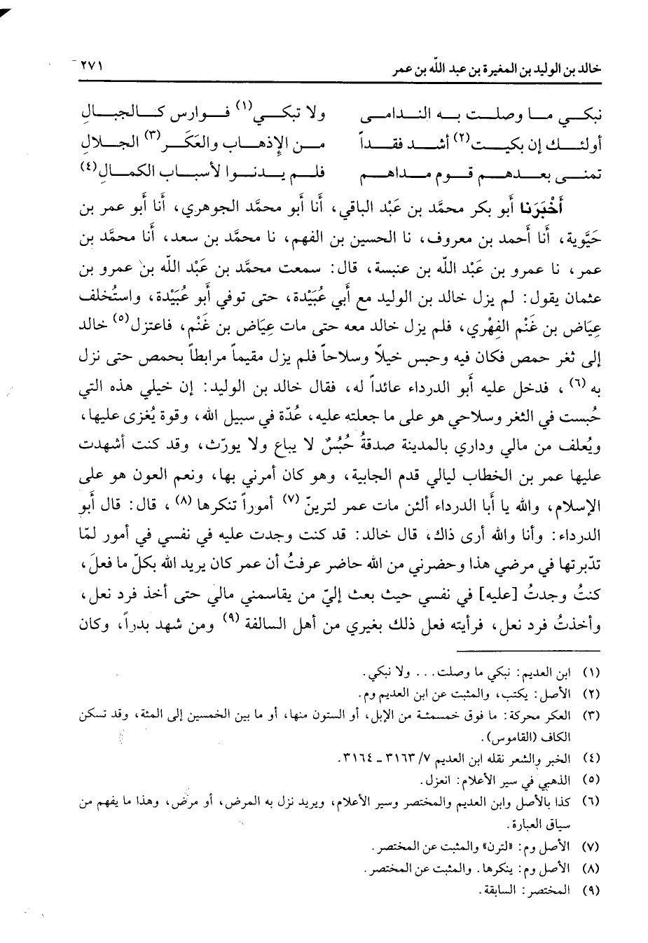 نبكي ما وصلت به الندامى * ولا تبكي (1) فوارس كالجبال أولئك إن بكيت (2) أشد فقدا * من الإذهاب والعكر (3) الجلال تمنى بعدهم قوم مداهم * فلم يدنوا لأسباب الكمال (4) أخبرنا أبو بكر محمد بن عبد الباقي أنا أبو محمد الجوهري أنا أبو عمر بن حيوية أنا أحمد بن معروف نا الحسين بن الفهم نا محمد بن سعد أنا محمد بن عمر نا عمرو بن عبد الله بن عنبسة قال سمعت محمد بن عبد الله بن عمرو بن عثمان يقول لم يزل خالد بن الوليد مع أبي عبيدة حتى توفي أبو عبيدة واستخلف عياض بن غنم الفهري فلم يزل خالد معه حتى مات عياض بن غنم فاعتزل (5) خالد إلى ثغر حمص فكان فيه وحبس خيلا وسلاحا فلم يزل مقيما مرابطا بحمص حتى نزل به (6) فدخل عليه أبو الدراداء عائدا له فقال خالد بن الوليد إن خيلي هذه التي حبست في الثغر وسلاحي هو على ما جعلته عليه عدة في سبيل الله وقوة يغزى عليها ويعلف من مالي وداري بالمدينة صدقة حبس لا يباع ولا يورث وقد كنت أشهدت عليها عمر بن الخطاب ليالي قدم الجابية وهو كان أمرني بها ونعم العون هو على الإسلام والله يا أبا الدرداء ألئن مات عمر لترين (7) أمورا تنكرها (8) قال قال أبو الدرداء وأنا والله أرى ذاك قال خالد قد كنت وجدت عليه في نفسي في أمور لما تدبرتها في مرضي هذا وحضرني من الله حاضر عرفت أن عمر كان يريد الله بكل ما فعل كنت وجدت عليه في نفسي حيث بعث إلي من يقاسمني مالي حتى أخذ فرد نعل وأخذت فرد نعل فرأيته فعل ذلك بغيري من أهل السالفة (9) ومن شهد بدرا وكان
