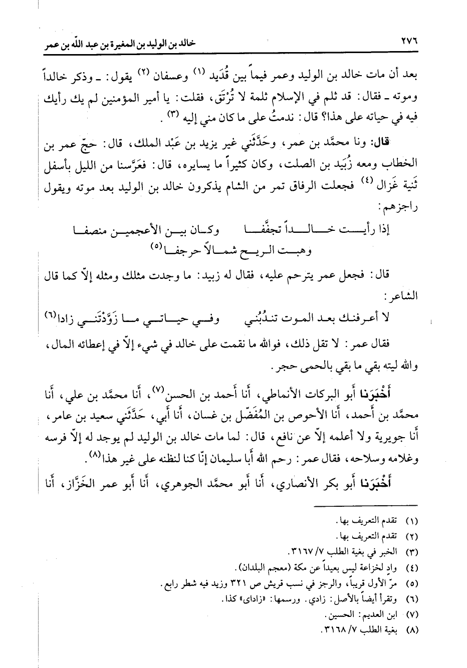 بعد أن مات خالد بن الوليد وعمر فيما بين قديد (1) وعسفان (2) يقول وذكر خالدا وموته فقال قد ثلم في الإسلام ثلمة لا ترتق فقلت يا أمير المؤمنين لم يك رأيك فيه في حياته على هذا قال ندمت على ما كان مني إليه (3) قال ونا محمد بن عمر وحدثني غير يزيد بن عبد الملك قال حج عمر بن الخطاب ومعه زبيد بن الصلت وكان كثيرا ما يسايره قال فعرسنا من الليل بأسفل ثنية غزال (4) فجعلت الرفاق تمر من الشام يذكرون خالد بن الوليد بعد موته ويقول راجزهم إذا رأيت خالدا تجففا * وكان بين الأعجمين منصفا وهبت الريح شمالا حرجفة (5) قال فجعل عمر يترحم عليه فقال له زبيد ما وجدت مثلك ومثله إلا كما قال الشاعر لا أعرفنك بعد الموت تندبني * وفي حياتي ما زودتني زادا (6) * فقال عمر لا تقل ذلك فوالله ما نقمت على خالد في شئ إلا في إعطائه المال والله ليته بقي ما بقي بالحمى حجر أخبرنا أبو البركات الأنماطي أنا أحمد بن الحسن (7) أنا محمد بن علي أنا محمد بن أحمد أنا الأحوص بن المفضل بن غسان أنا أبي حدثني سعيد بن عامر أنا جويرية ولا أعلمه إلا عن نافع قال لما مات خالد بن الوليد لم يوجد له إلا فرسه وغلامه وسلاحه فقال عمر رحم الله أبا سليمان إنا كنا لنظنه على غير هذا (8) أخبرنا أبو بكر الأنصاري أنا أبو محمد الجوهري أنا أبو عمر الخزاز أنا