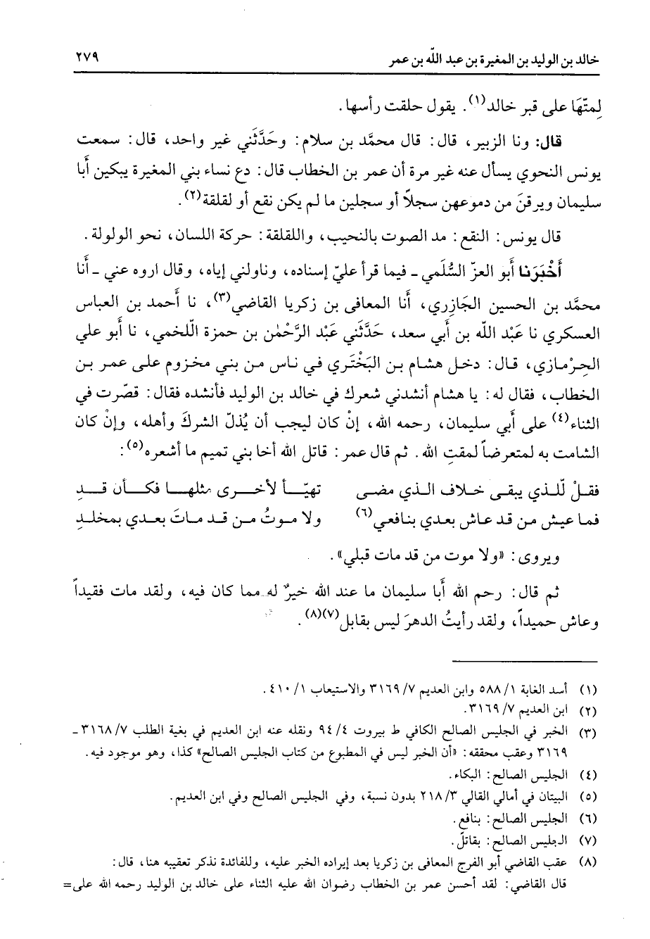 لمتها على قبر خالد (1) يقول حلقت رأسها قال ونا الزبير قال قال محمد بن سلام وحدثني غير واحد قال سمعت يونس النحوي يسأل عنه غير مرة أن عمر بن الخطاب قال دع نساء بني المغيرة يبكين أبا سليمان ويرقن من دموعهن سجلا أو سجلين ما لم يكن نقع أو لقلقة (2) قال يونس النقع مد الصوت بالنحيب واللقلقة حركة اللسان نحو الولولة أخبرنا أبو العز السلمي فيما قرأ علي إسناده وناولني إياه وقال اروه عني أنا محمد بن الحسين الجازري أنا المعافى بن زكريا القاضي (3) نا أحمد بن العباس العسكري نا عبد الله بن أبي سعد حدثني عبد الرحمن بن حمزة اللخمي نا أبو علي الحرمازي قال دخل هشام بن البختري في ناس من بني مخزوم على عمر بن الخطاب فقال له يا هشام أنشدني شعرك في خالد بن الوليد فأنشده فقال قصرت في الثناء (4) على أبي سليمان رحمه الله إن كان ليجب أن يذل الشرك وأهله وإن كان الشامت به لمتعرضا لمقت الله ثم قال عمر قاتل الله أخا بني تميم ما أشعره (5) فقل للذي يبقى خلاف الذي مضى * تهيأ لأخرى مثلها فكأن قد فما عيش من قد عاش بعدي بنافعي (6) * ولا موت من قد مات بعدي بمخلد * ويروى ولا موت من قد مات قبلي ثم قال رحم الله أبا سليمان ما عند الله خير له مما كان فيه ولقد مات فقيدا وعاش حميدا ولقد رأيت الدهر ليس بقابل (7) (8)