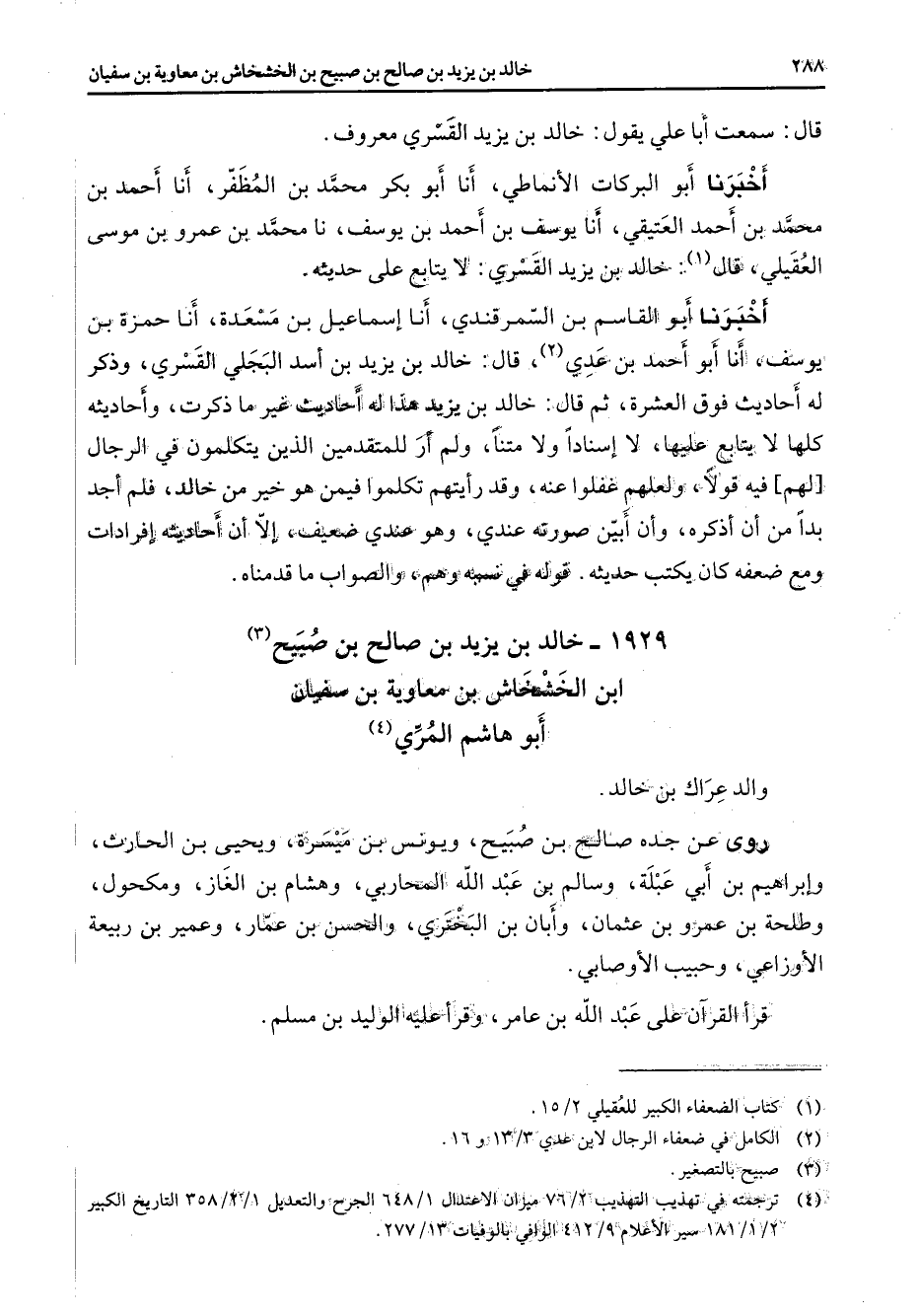 1929 - خالد بن يزيد بن صالح بن صبيح (3) بن الخشخاش بن معاوية بن سفيان أبو هاشم المري (3) والد عراك بن خالد روى عن جده صالح بن صبيح ويونس بن ميسرة ويحيى بن الحارث وإبراهيم بن أبي عبلة وسالم بن عبد الله المحاربي وهشام بن الغاز ومكحول وطلحة بن عمرو بن عثمان وأبان بن البختري والحسن بن عمار وعمير بن ربيعة الأوزاعي وحبيب الأوصابي قرأ القرآن على عبد الله بن عامر وقرأ عليه الوليد بن مسلم