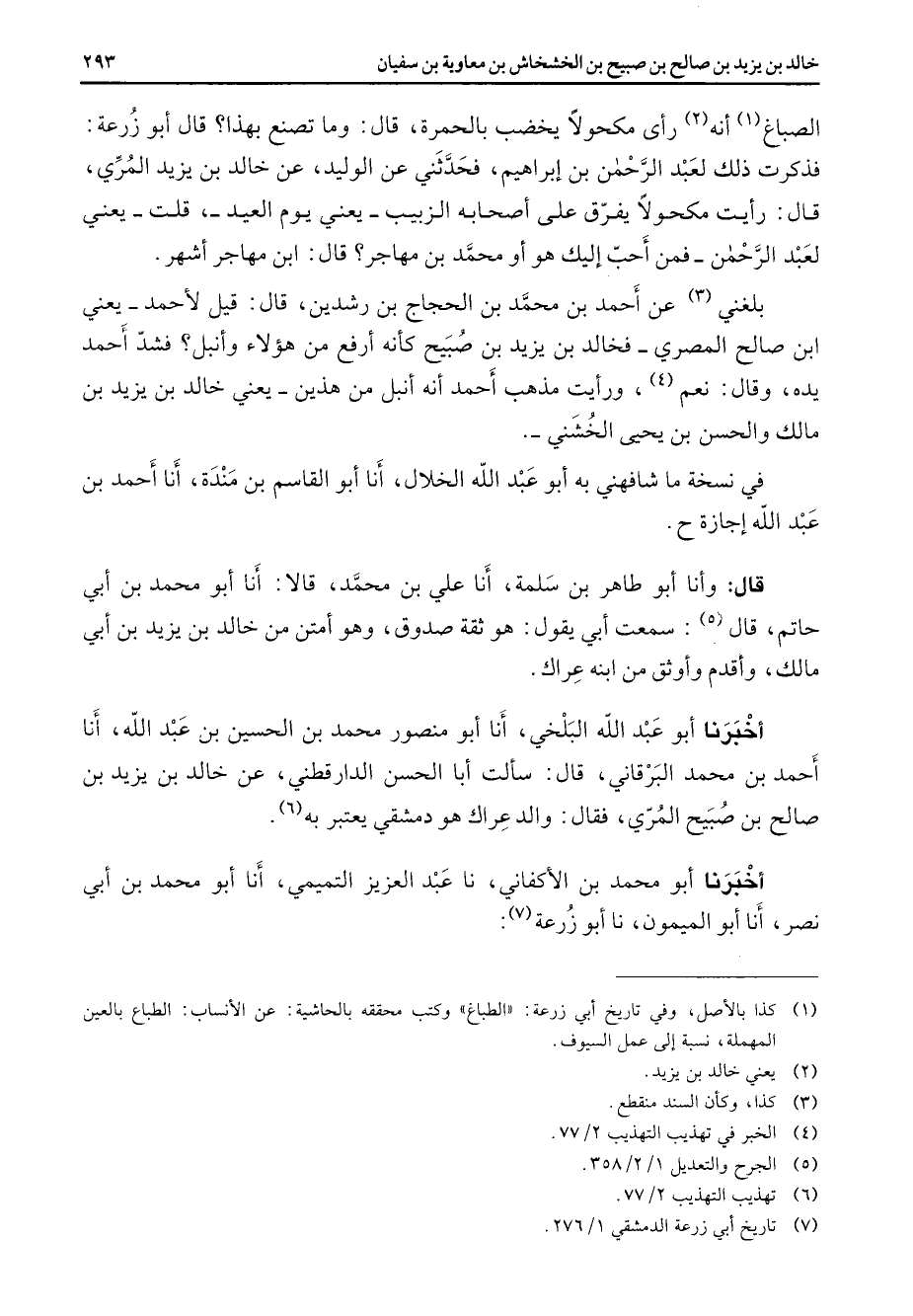 الصباغ (1) إنه (2) رأى مكحولا يخضب بالحمرة قال وما تصنع بهذا قال أبو زرعة فذكرت ذلك لعبد الرحمن بن إبراهيم فحدثني عن الوليد عن خالد بن يزيد المري قال رأيت مكحولا يفرق على أصحابه الزبيب يعني يوم العيد قلت يعني لعبد الرحمن فمن أحب إليك هو محمد بن مهاجر قال ابن مهاجر أشهر بلغني (3) عن أحمد بن محمد بن الحجاج بن رشدين قال قيل لأحمد يعني ابن صالح المصري فخالد بن يزيد بن صبيح كأنه أرفع من هؤلاء وأنبل فشد أحمد يده وقال نعم (4) ورأيت مذهب أحمد إنه أنبل من هذين يعني خالد بن يزيد بن مالك والحسن بن يحيى الخشني في نسخة ما شافهني به أبو عبد الله الخلال أنا أبو القاسم بن مندة أنا أحمد بن عبد الله إجازة قال وأنا أبو طاهر بن سلمة أنا علي بن محمد قالا أنا أبو محمد بن أبي حاتم قال (5) سمعت أبي يقول هو ثقة صدوق وهو أمتن من خالد بن يزيد بن أبي مالك وأقدم وأوثق به من ابنه عراك أخبرنا أبو عبد الله البلخي أنا أبو منصور محمد بن الحسين بن عبد الله أنا أحمد بن محمد البرقاني قال سألت أبا الحسن الدارقطني عن خالد بن يزيد بن صالح بن صبيح المري فقال والد عراك هو دمشقي يعتبر به (6) أخبرنا أبو محمد بن الأكفاني نا عبد العزيز التميمي أنا أبو محمد بن أبي نصر أنا أبو الميمون نا أبو زرعة (7)