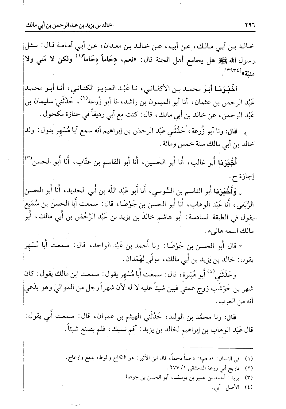 خالد بن أبي مالك عن أبيه عن خالد بن معدان عن أبي أمامة قال سئل رسول الله (صلى الله عليه وسلم) هل يجامع أهل الجنة قال نعم دحاما دحاما (1) ولكن لا مني ولا منية أخبرنا أبو محمد بن الأكفاني نا عبد العزيز الكتاني أنا أبو محمد عبد الرحمن بن عثمان أنا أبو الميمون بن راشد نا أبو زرعة (2) حدثني سليمان بن عبد الرحمن عن خالد بن أبي مالك قال كنت مع أبي رديفا في جنازة مكحول قال ونا أبو زرعة حدثني عبد الرحمن بن إبراهيم إنه سمع أبا مسهر يقول ولد خالد بن أبي مالك سنة خمس ومائة أخبرنا أبو غالب أنا أبو الحسين أنا أبو القاسم بن عتاب أنا أبو الحسن (3) إجازة وأخبرنا أبو القاسم بن السوسي أنا أبو عبد الله بن أبي الحديد أنا أبو الحسن الربعي أنا عبد الوهاب أنا أبو الحسن بن جوصا قال سمعت أبا الحسن بن سميع يقول في الطبقة السادسة أبو هاشم خالد بن يزيد بن عبد الرحمن بن أبي مالك أبو مالك اسمه هانئ قال أبو الحسن بن جوصا ونا أحمد بن عبد الواحد قال سمعت أبا مسهر يقول خالد بن يزيد بن أبي مالك مولى لهمدان وحدثني (4) أبو هبيرة قال سمعت أبا مسهر يقول سمعت ابن مالك يقول كان شهر بن حوشب زوج عمتي فبين شيئا عليه لا له لأن شهرا رجل من الموالي وهو يدعي إنه من العرب قال ونا محمد بن الوليد حدثني الهيثم بن عمران قال سمعت أبي يقول قال عبد الوهاب بن إبراهيم لخالد بن يزيد أقم نسبك فلم يصنع شيئا