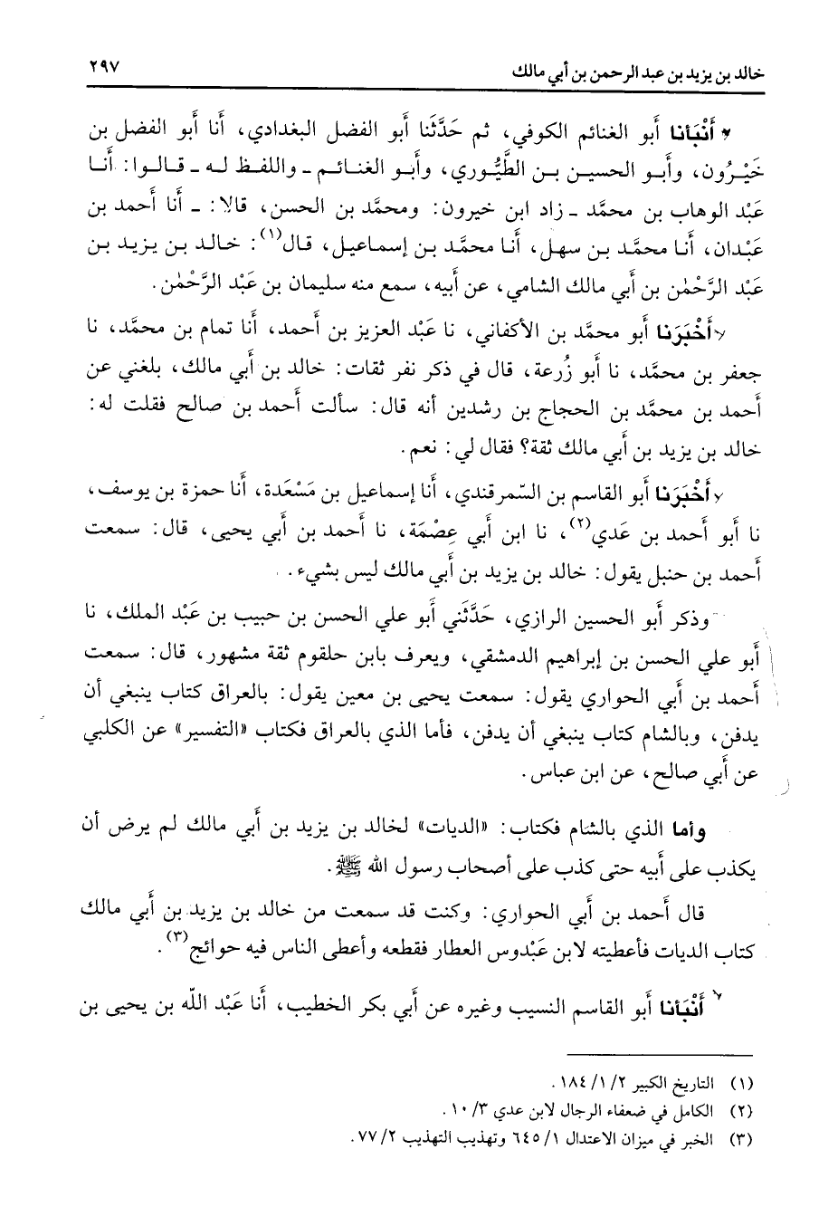 أنبأنا أبو الغنائم الكوفي ثم حدثنا أبو الفضل البغدادي أنا أبو الفضل بن خيرون وأبو الحسين بن الطيوري وأبو الغنائم واللفظ له قالوا أنا عبد الوهاب بن محمد زاد ابن خيرون ومحمد بن الحسن قالا أنا أحمد بن عبدان أنا محمد بن سهل أنا محمد بن إسماعيل قال (1) خالد بن يزيد بن عبد الرحمن بن أبي مالك الشامي عن أبيه سمع منه سليمان بن عبد الرحمن أخبرنا أبو محمد بن الأكفاني نا عبد العزيز بن أحمد أنا تمام بن محمد نا جعفر بن محمد نا أبو زرعة قال في ذكر نفر ثقات خالد بن أبي مالك بلغني عن أحمد بن محمد بن الحجاج بن رشدين أنه قال سألت أحمد بن صالح فقلت له خالد بن يزيد بن أبي مالك ثقة فقال لي نعم أخبرنا أبو القاسم بن السمرقندي أنا إسماعيل بن مسعدة أنا حمزة بن يوسف نا أبو أحمد بن عدي (2) نا ابن أبي عصمة نا أحمد بن أبي يحيى قال سمعت أحمد بن حنبل يقول خالد بن يزيد بن أبي مالك ليس بشئ وذكر أبو الحسين الرازي حدثني أبو علي الحسن بن حبيب بن عبد الملك نا أبو علي الحسن بن إبراهيم الدمشقي ويعرف بابن حلقوم ثقة مشهور قال سمعت أحمد بن أبي الحواري يقول سمعت يحيى بن معين يقول بالعراق كتاب ينبغي أن يدفن وبالشام كتاب ينبغي أن يدفن فأما الذي بالعراق فكتاب التفسير عن الكلبي عن أبي صالح عن ابن عباس وأما الذي بالشام فكتاب الديات لخالد بن يزيد بن أبي مالك لم يرض أن يكذب على أبيه حتى كذب على أصحاب رسول الله (صلى الله عليه وسلم) قال أحمد بن أبي الحواري وكنت قد سمعت من خالد بن يزيد بن أبي مالك كتاب الديات فأعطيته لابن عبدوس العطار فقطعه وأعطى الناس فيه حوائج (3) أنبأنا أبو القاسم النسيب وغيره عن أبي بكر الخطيب أنا عبد الله بن يحيى بن