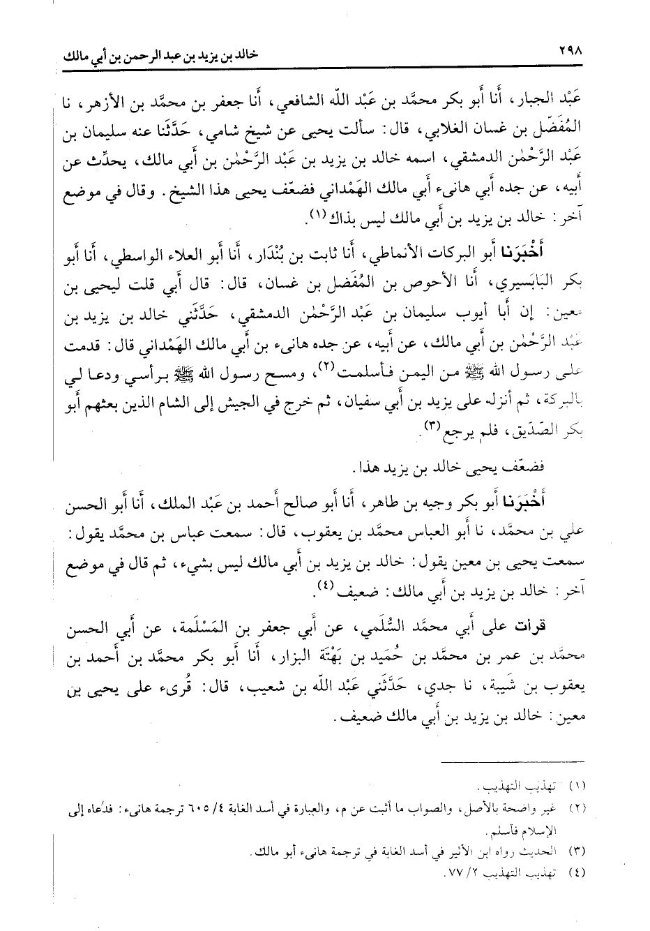 عبد الجبار أنا أبو بكر محمد بن عبد الله الشافعي أنا جعفر بن محمد بن الأزهر نا المفضل بن غسان الغلابي قال سألت يحيى عن شيخ شامي حدثنا عنه سليمان بن عبد الرحمن الدمشقي اسمه خالد بن يزيد بن عبد الرحمن بن أبي مالك يحدث عن أبيه عن جده أبي هانئ أبي مالك الهمداني فضعف يحيى هذا الشيخ وقال في موضع آخر خالد بن يزيد بن أبي مالك ليس بذاك (1) أخبرنا أبو البركات الأنماطي أنا ثابت بن بندار أنا أبو العلاء الواسطي أنا أبو بكر البابسيري أنا الأحوص بن المفضل بن غسان قال قال أبي قلت ليحيى بن معين إن أبا أيوب سليمان بن عبد الرحمن الدمشقي حدثني خالد بن يزيد بن عبد الرحمن بن أبي مالك عن أبيه عن جده هانئ بن أبي مالك الهمداني قال قدمت على رسول الله (صلى الله عليه وسلم) من اليمن فأسلمت (2) ومسح رسول الله (صلى الله عليه وسلم) برأسي ودعا لي بالبركة ثم أنزله على يزيد بن أبي سفيان ثم خرج في الجيش إلى الشام الذين بعثهم أبو بكر الصديق فلم يرجع (3) فضعف يحيى خالد بن يزيد هذا أخبرنا أبو بكر وجيه بن طاهر أنا أبو صالح أحمد بن عبد الملك أنا أبو الحسن علي بن محمد نا أبو العباس محمد بن يعقوب قال سمعت عباس بن محمد يقول سمعت يحيى بن معين يقول خالد بن يزيد بن أبي مالك ليس بشئ ثم قال في موضع آخر خالد بن يزيد بن أبي مالك ضعيف (4) قرأت على أبي محمد السلمي عن أبي جعفر بن المسلمة عن أبي الحسن محمد بن عمر بن محمد بن حميد بن بهتة البزار أنا أبو بكر محمد بن أحمد بن يعقوب بن شيبة نا جدي حدثني عبد الله بن شعيب قال قرئ على يحيى بن معين خالد بن يزيد بن أبي مالك ضعيف