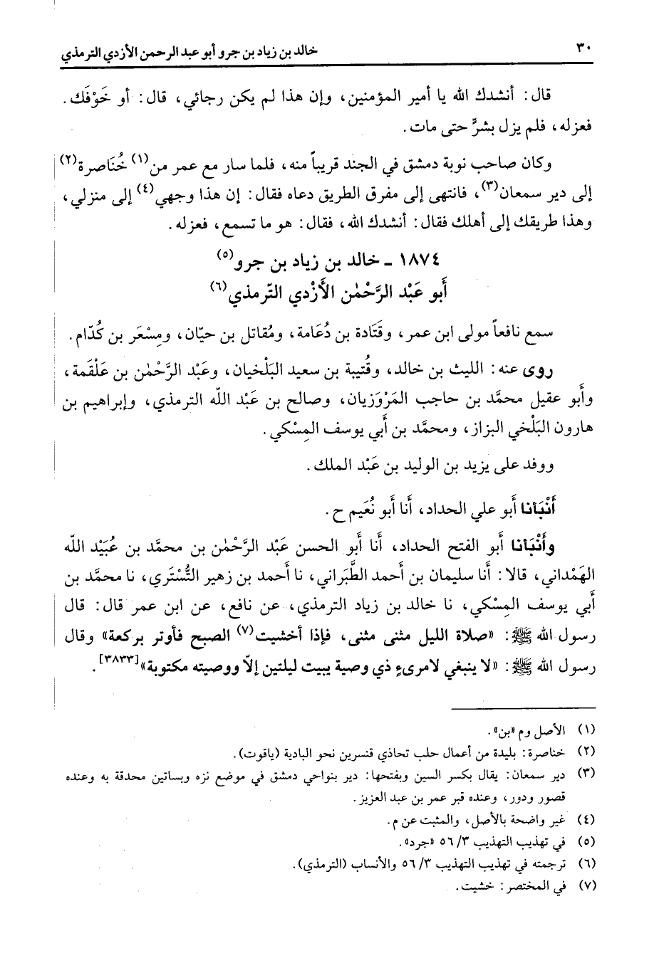 1874 - خالد بن زياد بن جرو (5) أبو عبد الرحمن الأزدي الترمذي (6) سمع نافعا مولى ابن عمر وقتادة بن دعامة ومقاتل بن حيان ومسعر بن كدام روى عنه الليث بن خالد وقتيبة بن سعيد البلخيان وعبد الرحمن بن علقمة وأبو عقيل محمد بن حاجب المروزيان وصالح بن عبد الله الترمذي وإبراهيم بن هارون البلخي البزاز ومحمد بن أبي يوسف المسكي ووفد على يزيد بن الوليد بن عبد الملك أنبأنا أبو علي الحداد أنا أبو نعيم وأنبأنا أبو الفتح الحداد أنا أبو الحسن عبد الرحمن بن محمد بن عبيد الله الهمداني قالا أنا سليمان بن أحمد الطبراني نا أحمد بن زهير التستري نا محمد بن أبي يوسف المسكي نا خالد بن زياد الترمذي عن نافع عن ابن عمر قال قال رسول الله (صلى الله عليه وسلم) صلاة الليل مثنى مثنى فإذا أخشيت (7) الصبح فأوتر بركعة وقال رسول الله (صلى الله عليه وسلم) لا ينبغي لامرئ ذي وصية يبيت ليلتين إلا ووصيته مكتوبة