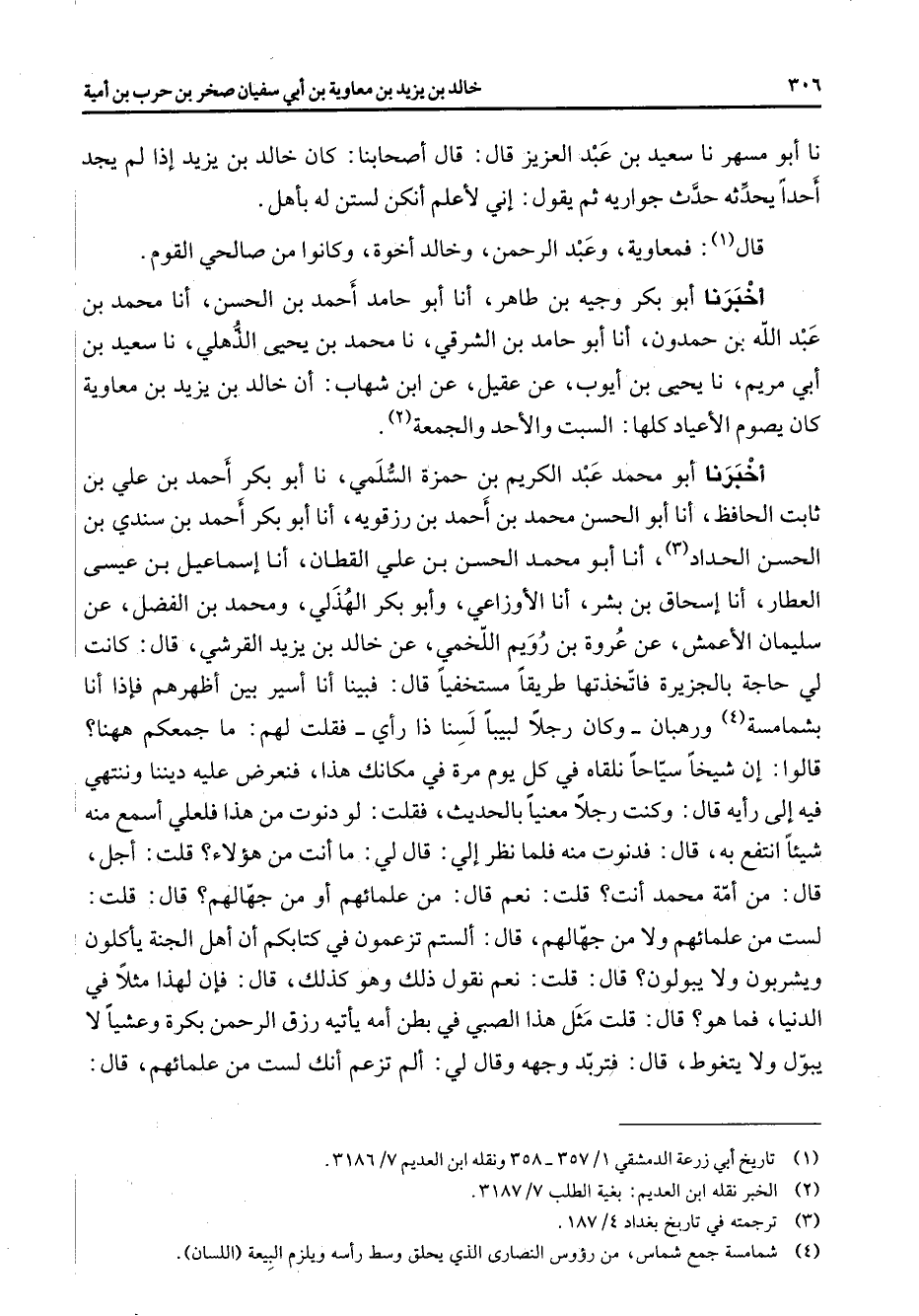 نا أبو مسهر نا سعيد بن عبد العزيز قال قال أصحابنا كان خالد بن يزيد إذا لم يجد أحد يحدثه حدث جواريه ثم يقول إني لأعلم أنكن لستن له بأهل قال (1) فمعاوية وعبد الرحمن وخالد أخوة وكانوا من صالحي القوم أخبرنا أبو بكر وجيه بن طاهر أنا أبو حامد أحمد بن الحسن أنا محمد بن عبد الله بن حمدون أنا أبو حامد بن الشرقي نا محمد بن يحيى الذهلي نا سعيد بن أبي مريم نا يحيى بن أيوب عن عقيل عن ابن شهاب أن خالد بن يزيد بن معاوية كان يصوم الأعياد كلها السبت والأحد والجمعة (2) أخبرنا أبو محمد عبد الكريم بن حمزة السلمي نا أبو بكر أحمد بن علي بن ثابت الحافظ أنا أبو الحسن محمد بن أحمد بن رزقويه أنا أبو بكر أحمد بن سندي بن الحسن الحداد (3) أنا أبو محمد الحسن بن علي القطان أنا إسماعيل بن عيسى العطار أنا إسحاق بن بشر أنا الأوزاعي وأبو بكر الهذلي ومحمد بن الفضل عن سليمان الأعمش عن عروة بن رويم اللخمي عن خالد بن يزيد القرشي قال كانت لي حاجة بالجزيرة فاتخذتها طريقا مستخفيا قال فبينا أنا أسير بين أظهرهم فإذا أنا بشمامسة (4) ورهبان وكان رجلا لبيبا لسنا ذا رأي فقلت له ما جمعكم ههنا قالوا إن شيخا سياحا نلقاه في كل يوم مرة في مكانك هذا فنعرض عليه ديننا وننتهي فيه إلى رأيه قال وكنت رجلا معنيا بالحديث فقلت لو دنوت من هذا فلعلي أسمع منه شيئا أنتفع به قال فدنوت منه فلما نظر إلي قال لي ما أنت من هؤلاء قلت أجل قال من أمة محمد أنت قلت نعم قال من علمائهم أو من جهالهم قال قلت لست من علمائهم ولا من جهالهم قال ألستم تزعمون في كتابكم أن أهل الجنة يأكلون ويشربون ولا يبولون قال قلت نعم نقول ذلك وهو كذلك قال فإن لهذا مثلا في الدنيا فما هو قال قلت مثل هذا الصبي في بطن أمه يأتيه رزق الرحمن بكرة وعشيا لا يبول ولا يتغوط قال فتربد وجهه وقال لي ألم تزعم أنك لست من علمائهم قال