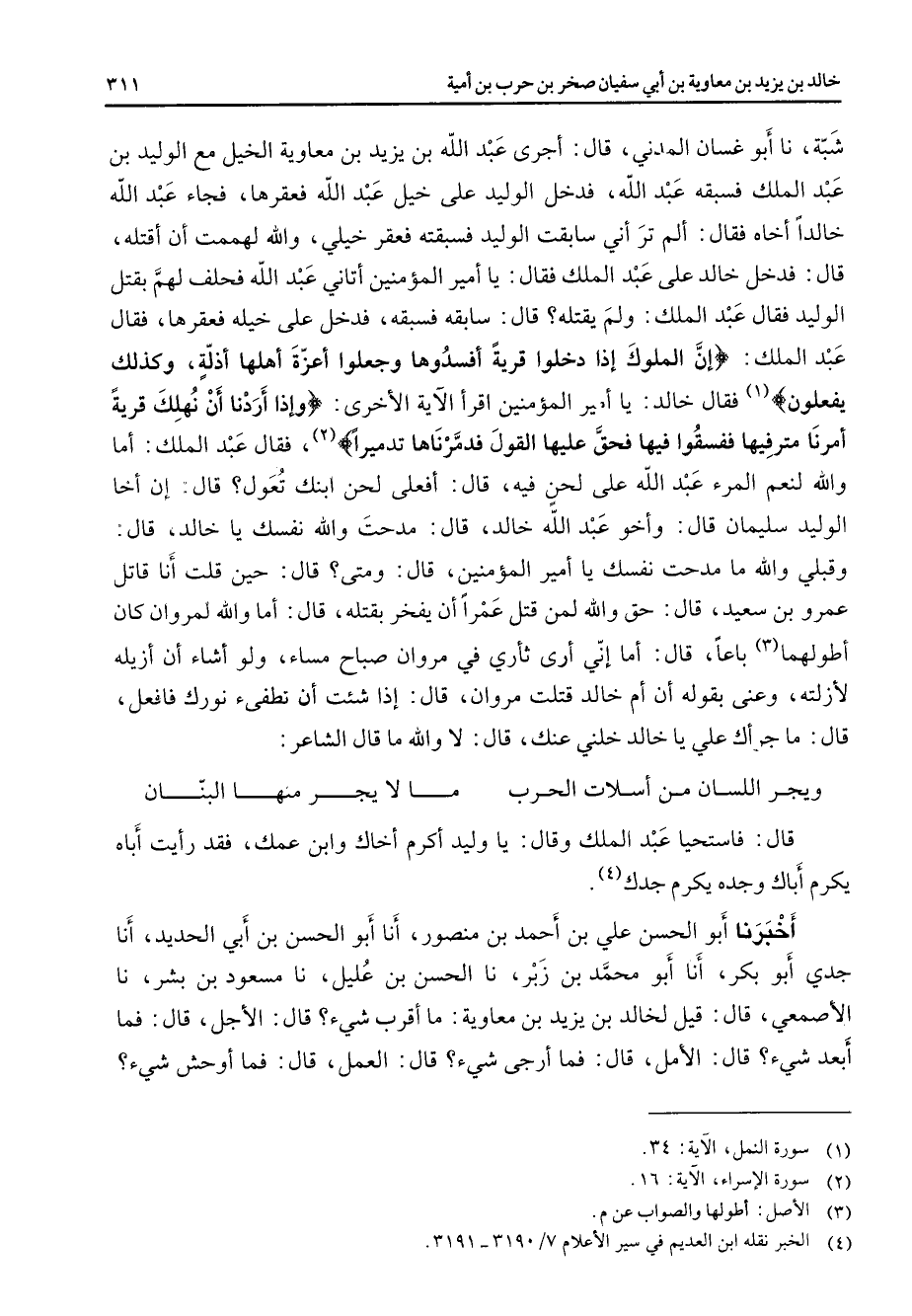 شبة أنا أبو غسان المدني قال أجرى عبد الله بن يزيد بن معاوية الخيل مع الوليد بن عبد الملك فسبقه عبد الله فدخل الوليد على خيل عبد الله فعقرها فجاء عبد الله خالدا أخاه فقال ألم تر أني سابقت الوليد فسبقته فعقر خيلي والله لهممت أن أقتله قال فدخل خالد على عبد الملك فقال يا أمير المؤمنين أتاني عبد الله فحلف لهم بقتل الوليد فقال عبد الملك ولم يقتله قال سابقه فسبقه فدخل على خيله فعقرها فقال عبد الملك " إن الملوك إذا دخلوا قرية أفسدوها وجعلوا أعزة أهلها أذلة وكذلك يفعلون " (1) فقال خالد يا أمير المؤمنين اقرأ الآية الأخرى " وإذا أردنا أن نهلك قرية أمرنا مترفيها ففسقوا فيها فحق عليها القول فدمرناها تدميرا " (2) فقال عبد الملك أما والله لنعم المرء عبد الله على لحن فيه قال أفعلى لحن ابنك تعول قال إن أخا الوليد سليمان قال وأخو عبد الله خالد قال مدحت والله نفسك يا خالد قال وقبلي والله ما مدحت نفسك يا أمير المؤمنين قال ومتى قال حين قلت أنا قاتل عمرو بن سعيد قال حق والله لمن قتل عمرا أن يفخر بقتله قال أما والله لمروان كان أطولهما (3) باعا قال أما إني أرى ثأري في مروان صباح مساء ولو أشاء أن أزيله لأزلته وعنى بقوله أن أم خالد قتلت مروان قال إذا شئت أن نطفئ نورك فافعل قال ما جرأك علي يا خالد خلني عنك قال لا والله ما قال الشاعر ويجر اللسان من أسلات الحرب * ما لا يجر منها البنان * قال فاستحيا عبد الملك وقال يا وليد أكرم أخاك وابن عمك فقد رأيت أباه يكرم أباك وجده يكرم جدك (4) أخبرنا أبو الحسن علي بن أحمد بن منصور أنا أبو الحسن بن أبي الحديد أنا جدي أبو بكر أنا أبو محمد بن زبر نا الحسن بن عليل نا مسعود بن بشر نا الأصمعي قال قيل لخالد بن يزيد بن معاوية ما أقرب شئ قال الأجل قال فما أبعد شئ قال الأمل قال فما أرجى شئ قال العمل قال فما أوحش شئ