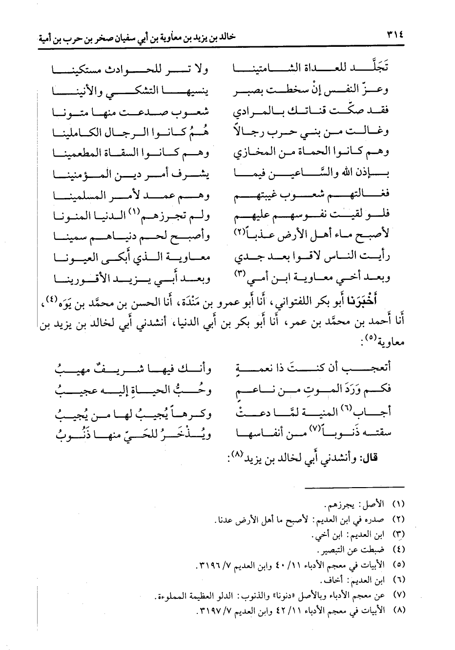 * تجلد للعداة الشامتينا * ولا تر للحوادث مستكينا وعز النفس إن سخطت بصبر * ينسيها التشكي والأنينا فقد صكت قناتك بالمرادي * شعوب صدعت منها متونا وغالت من بني حرب رجالا * هم كانوا الرجال الكاملينا وهم كانوا الحماة من المخازي * وهم كانوا السقاة المطعمينا بإذن الله والساعين فيما * يشرف أمر دين المؤمنينا فغالتهم شعوب غيبتهم * وهم عمد لأمر المسلمينا * * فلو لقيت نفوسهم عليهم * ولم تجرزهم (1) الدنيا المنونا لأصبح ماء أهل الأرض عذبا (2) * وأصبح لحم دنياهم سمينا رأيت الناس لاقوا بعد جدي * معاوية الذي أبكى العيونا وبعد أخي معاوية ابن أمي * (3) وبعد أبي يزيد الأقورينا * أخبرنا أبو بكر اللفتواني أنا أبو عمرو بن مندة أنا الحسن بن محمد بن يوه (4) أنا أحمد بن محمد بن عمر أنا أبو بكر بن أبي الدنيا أنشدني أبي لخالد بن يزيد بن معاوية (5) * أتعجب أن كنت ذا نعمة * وأنك فيها شريف مهيب فكم ورد الموت من ناعم * وحب الحياة إليه عجيب أجاب (6) المنية لما دعت * وكرها يجيب لها من يجيب سقته ذنوبا (7) من أنفاسها * ويذخر للحي منها ذنوب * قال وأنشدني أبي لخالد بن يزيد * (8)