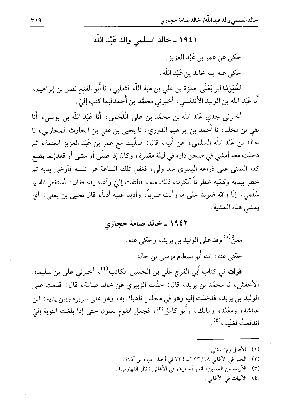 1942 - خالد بن صامة حجازي مغن (1) وفد على الوليد بن يزيد وحكى عنه حتى عنه ابنه أبو بسطام موسى بن خالد قرأت في كتاب أبي الفرج علي بن الحسين الكاتب (2) أخبرني علي بن سليمان الأخفش نا محمد بن يزيد قال حدث الزبيري عن خالد صامة قال قدمت على الوليد بن يزيد فدخلت إليه وهو في مجلس ناهيك به وهو على سريره وبين يديه ابن عائشة ومعبد ومالك وأبو كامل فجعل القوم يغنون حتى إذا بلغت النوبة إلي اندفعت فغنيت (4)