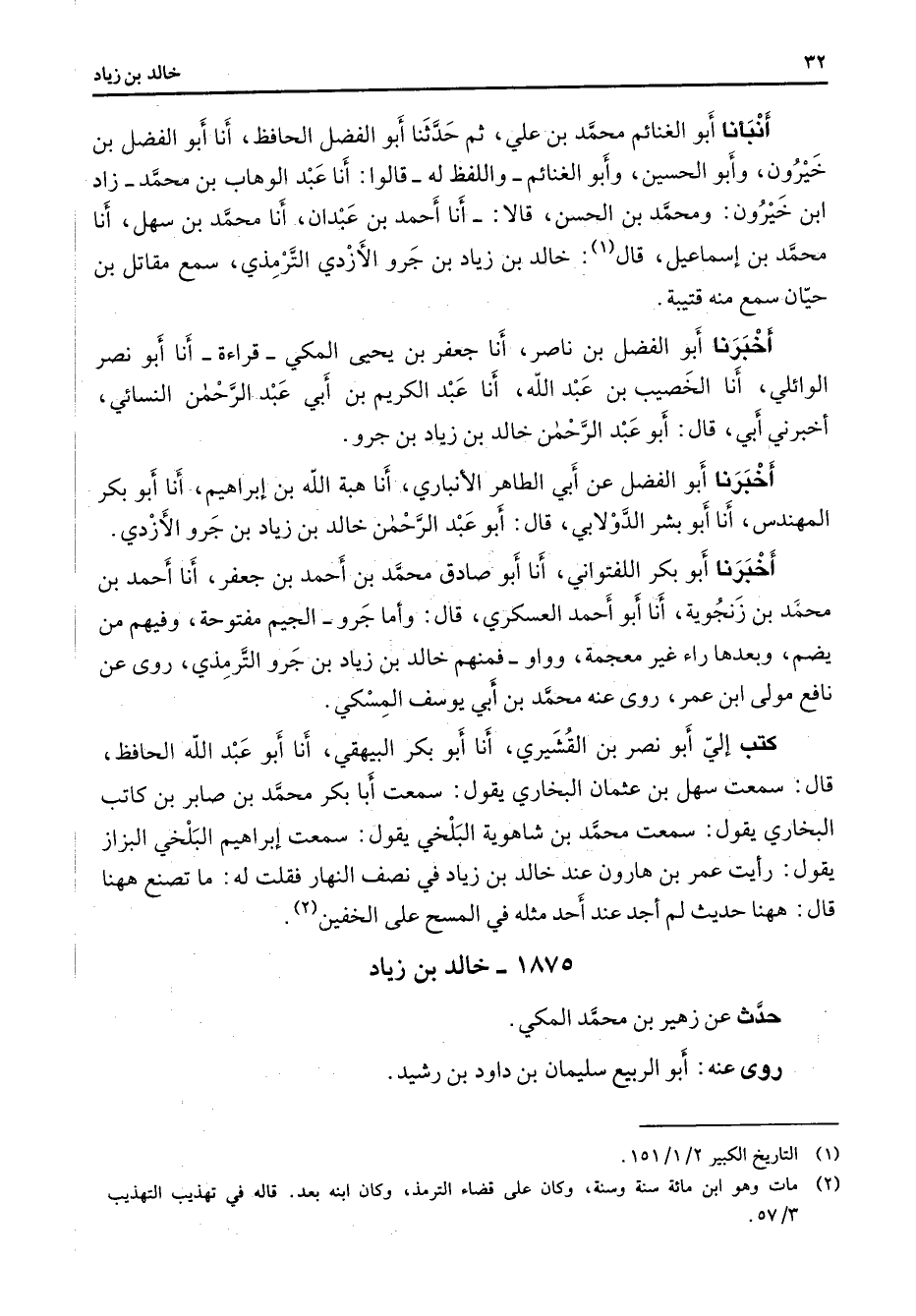 أنبأنا أبو الغنائم محمد بن علي ثم حدثنا أبو الفضل الحافظ أنا أبو الفضل بن خيرون وأبو الحسين وأبو الغنائم واللفظ له قالوا أنا عبد الوهاب بن محمد زاد ابن خيرون ومحمد بن الحسن قالا أنا أحمد بن عبدان أنا محمد بن سهل أنا محمد بن إسماعيل قال (1) خالد بن زياد بن جرو الأزدي الترمذي سمع مقاتل بن حيان سمع منه قتيبة أخبرنا أبو الفضل بن ناصر أنا جعفر بن يحيى المكي قراءة أنا أبو نصر الوائلي أنا الخصيب بن عبد الله أنا عبد الكريم بن أبي عبد الرحمن النسائي أخبرني أبي قال أبو عبد الرحمن خالد بن زياد بن جرو أخبرنا أبو الفضل عن أبي الطاهر الأنباري أنا هبة الله بن إبراهيم أنا أبو بكر المهندس أنا أبو بشر الدولابي قال أبو عبد الرحمن خالد بن زياد بن جرو الأزدي أخبرنا أبو بكر اللفتواني أنا أبو صادق محمد بن أحمد بن جعفر أنا أحمد بن محمد بن زنجوية أنا أبو أحمد العسكري قال وأما جرو الجيم مفتوحة وفيهم من يضم وبعدها راء غير معجمة وواو فمنهم خالد بن زياد بن جرو الترمذي روى عن نافع مولى ابن عمر روى عنه محمد بن أبي يوسف المسكي كتب إلي أبو نصر بن القشيري أنا أبو بكر البيهقي أنا أبو عبد الله الحافظ قال سمعت سهل بن عثمان البخاري يقول سمعت أبا بكر محمد بن صابر بن كاتب البخاري يقول سمعت محمد بن شاهوية البلخي يقول سمعت إبراهيم البلخي البزاز يقول رأيت عمر بن هارون عند خالد بن زياد في نصف النهار فقلت له ما تصنع ههنا قال ههنا حديث لم أجد عند أحد مثله في المسح على الخفين (2) 1875 خالد بن زياد حدث عن زهير بن محمد المكي روى عنه أبو الربيع سليمان بن داود بن رشيد