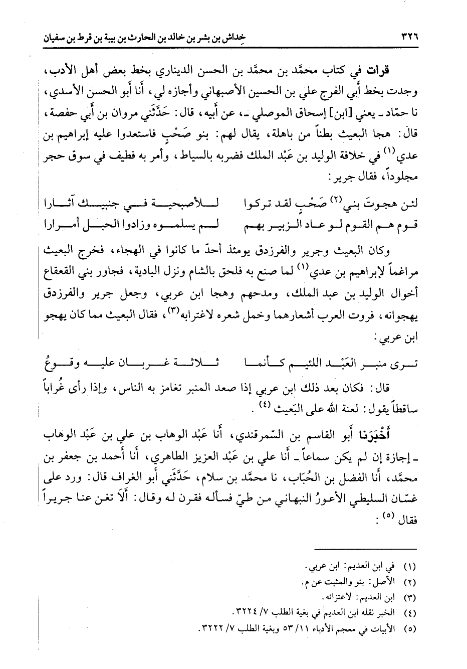 قرأت في كتاب محمد بن محمد بن الحسن الديناري بخط بعض أهل الأدب وجدت بخط أبي الفرج علي بن الحسين الأصبهاني وأجازه لي أنا أبو الحسن الأسدي نا حماد يعني ابن إسحاق الموصلي عن أبيه قال حدثني مروان بن أبي حفصة قال هجا البعيث بطنا من باهلة يقال لهم بنو صحب فاستعدوا عليه إبراهيم بن عدي (1) في خلافة الوليد بن عبد الملك فضربه بالسياط وأمر به فطيف في سوق حجر مجلودا فقال جرير * لئن هجوت بني (2) صحب لقد تركوا * للأصبحية في جنبيك آثارا قوم هم القوم لو عاد الزبير بهم * لم يسلموه وزادوا الحبل أمرارا * وكان البعيث وجرير والفرزدق يومئذ أحد ما كانوا في الهجاء فخرج البعيث مراغما لإبراهيم بن عدي (1) لما صنع به فلحق بالشام ونزل البادية فجاور بني القعقاع أخوال الوليد بن عبد الملك ومدحهم وهجا ابن عربي وجعل جرير والفرزدق يهجوانه فروت العرب أشعارهما وخمل شعره لاغترابه (3) فقال البعيث مما كان يهجو ابن عربي ترى منبر العبد اللئيم كأنما * ثلاثة غربان عليه وقوع * قال فكان بعد ذلك ابن عربي إذا صعد المنبر تغامز به الناس وإذا رأى غرابا ساقطا يقول لعنة الله على البعيث (4) أخبرنا أبو القاسم بن السمرقندي أنا عبد الوهاب بن علي بن عبد الوهاب إجازة إن لم يكن سماعا أنا علي بن عبد العزيز الطاهري أنا أحمد بن جعفر بن محمد أنا الفضل بن الحباب نا محمد بن سلام حدثني أبو الغراف قال ورد على غسان السليطي الأعور النبهاني من طي فسأله فقرن له وقال ألا تغن عنا جريرا فقال (5) *