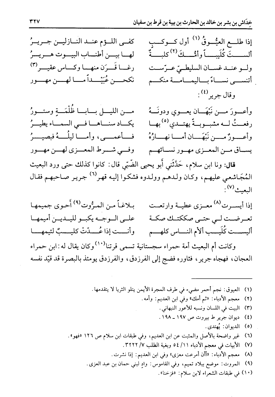 إذا طلع العيوق (1) أول كوكب * كفى اللؤم عند النازلين جرير ألست كليبا وأمك (2) كلبة * لها بين أطناب البيوت هرير ولو عند غسان السليطي عرست * رغا قرن منها وكاس عقير (3) أتنسى نساء باليمامة منكم * نكحن عبيدا ما لهن مهور * وقال جرير (4) * وأعور من نبهان يعوي ودونه * من الليل بابا ظلمة وستور رفعت له مشبوبة يهتدي (5) بها * يكاد سناها في السماء يطير وأعور من نبهان أما نهاره * فأعمى وأما ليله فبصير يساق من المعزى مهور نسائهم * وفي شرط المعزى لهن مهور * قال ونا ابن سلام حدثني أبو يحيى الضبي قال كانوا كذلك حتى ورد البعيث المجاشعي عليهم وكان ولدهم وولدوه فشكوا إليه قهر (6) جرير صاحبهم فقال البعيث (7) * إذا أيسرت (8) معزى عطية وارتعت * بلاغا من المروت (8) أحوى جميمها تعرضت لي حتى صككتك صكة * على الوجه يكبو لليدين أميمها أليست كليب ألأم الناس كلهم * وأنت إذا عدت كليب لئيمها * وكانت أم البعيث أمة حمراء سجستانية تسمى قرتنا (10) وكان يقال له ابن حمراء العجان فهجاه جرير فثاوره فضج إلى الفرزدق والفرزدق يومئذ بالبصرة قد قيد نفسه