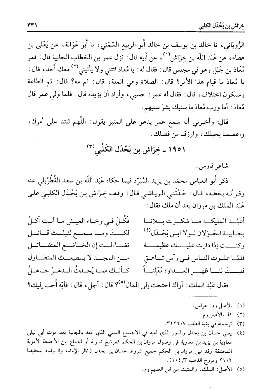 1951 - خراش بن بحدل الكلبي (3) شاعر فارس ذكر أبو العباس محمد بن يزيد المبرد فيما حكاه عبد الله بن سعد القطربلي عنه وقرأته بخطه قال حدثني الرياشي قال وقف خراش بن بحدل الكلبي على عبد الملك بن مروان بعد أن ملك فقال أعبد المليكة ما شكرت بلانا * فكل في رخاء العيش ما أنت آكل بجابية الجولان لولا ابن بحدل * (4) لكنت وما يسمع لقيلك قائل وكنت إذا دارت عليك عظيمة * تضاءلت إن الخاشع المتضائل فلما علوت الناس في رأس شاهق * من المجد لا يسطيعك المتطاول قلبت لنا ظهر العداوة معلنا * كأنك مما يحدث الدهر جاهل * فقال عبد الملك أراك احتجت إلى المال (5) قال أجل قال فأيه أحب إليك