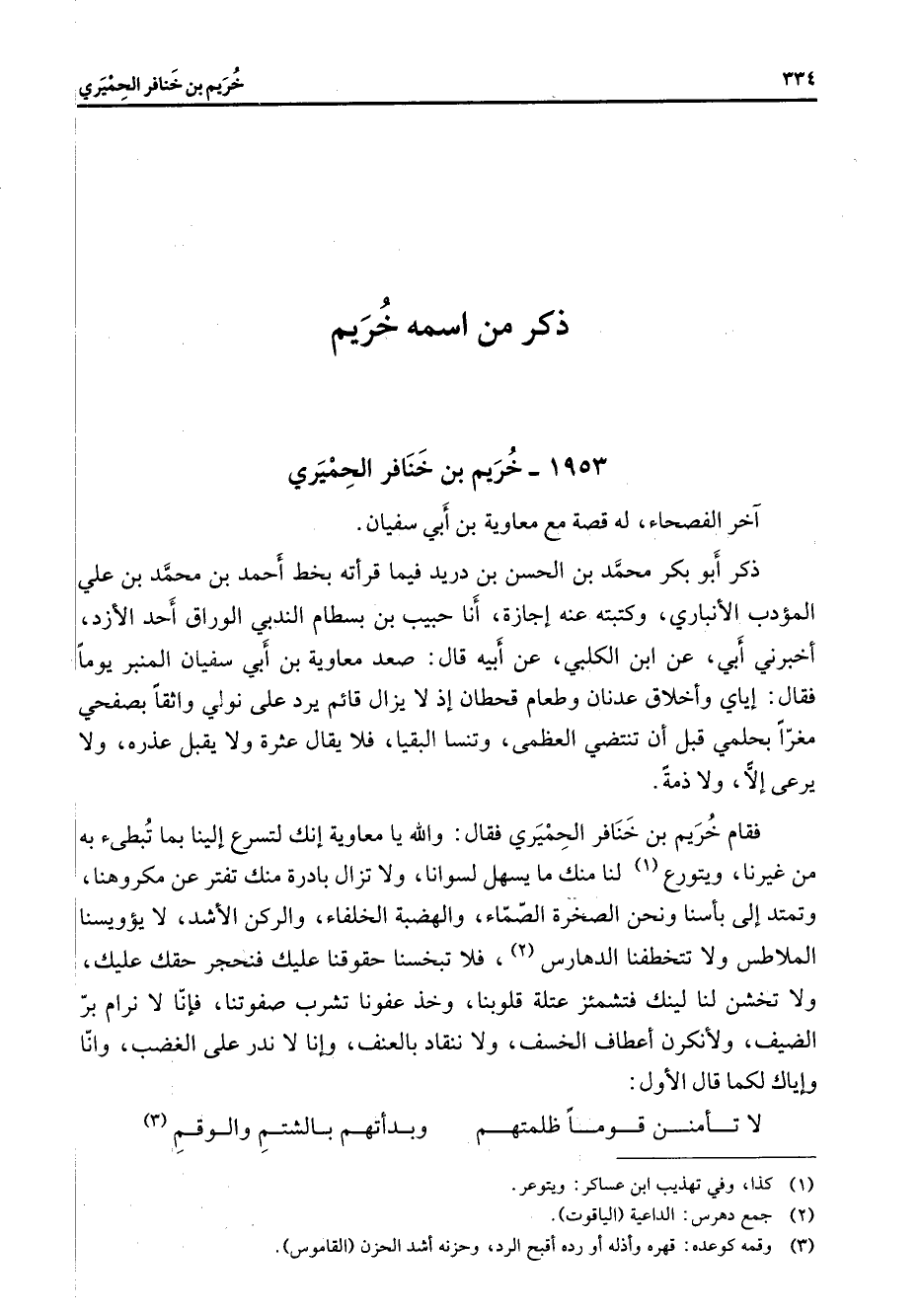 1953 - خريم بن خنافر الحميري آخر الفصحاء له قصة مع معاوية بن أبي سفيان ذكر أبو بكر محمد بن الحسن بن دريد فيما قرأته بخط أحمد بن محمد بن علي المؤدب الأنباري وكتبته عنه إجازة أنا حبيب بن بسطام الندبي الوراق أحد الأزد أخبرني أبي عن أبن الكلبي عن أبيه قال صعد معاوية بن أبي سفيان المنبر يوما فقال إياي وأخلاق عدنان وطعام قحطان إذ لا يزال قائم يرد على نولي واثقا بصفحي مغرا بحلمي قبل أن تنتضي العظمي وتنسا البقيا فلا يقال عثرة ولا يقبل عذره ولا يرعى إلا ولا ذمة فقام خريم بن خنافر الحميري فقال والله يا معاوية إنك لتسرع إلينا بما تبطئ به من غيرنا ويتورع (1) لنا منك ما يسهل لسوانا ولا تزال بادرة منك تفتر عن مكروهنا وتمتد إلى بأسنا ونحن الصخرة الصماء والهضبة الخلفاء والركن الأشد لا يؤويسنا الملاطس ولا تتخطفنا الدهارس (2) فلا تبخسنا حقوقنا عليك فنحجر حقك عليك ولا تخشن لنا لينك فتشمئز عتلة قلوبنا وخذ عفونا تشرب صفوتنا فإنا لا نرام بر الضيف ولأنكرن أعطاف الخسف ولا ننقاد بالعنف وإنا لا ندر على الغضب وأنا وإياك لكما قال الأول * لا تأمنن قوما ظلمتهم * وبدأتهم بالشتم والوقم (3)