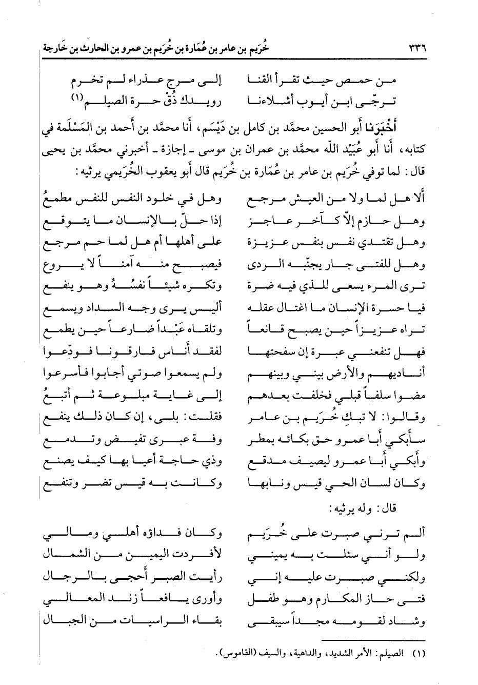 من حمص حيث تقرأ القنا * إلى مرج عذراء لم تخرم * ترجى ابن أيوب أشلاءنا * رويدك ذق حرة الصيلم (1) * أخبرنا أبو الحسين محمد بن كامل بن ديسم أنا محمد بن أحمد بن المسلمة في كتابه أنا أبو عبيد الله محمد بن عمران بن موسى إجازة أخبرني محمد بن يحيى قال لما توفي خريم بن عامر بن عمارة بن خريم قال أبو يعقوب الخريمي يرثيه ألا هل لما ولا من العيش مرجع * وهل في خلود النفس للنفس مطمع وهل حازم إلا كآخر عاجز * إذا حل بالإنسان ما يتوقع وهل تقتدي نفس بنفس عزيزة * على أهلها أم هل لما حم مرجع وهل للفتى جار يجنبه الردى * فيصبح منه آمنا لا يروع ترى المرء يسعى للذي فيه ضرة * وتكره شيئا نفسه وهو ينفع فيا حسرة الإنسان ما اغتال عقله * أليس يرى وجه السداد ويسمع تراه عزيزا حين يصبح قانعا * وتلقاه عبدا ضارعا حين يطمع فهل تنفعني عبرة إن سفحتها * لفقد أناس فارقونا فودعوا أناديهم والأرض بيني وبينهم * ولم يسمعوا صوتي أجابوا فأسرعوا مضوا سلفا قبلي فخلفت بعدهم * إلى غاية مبلوعة ثم أتبع وقالوا لا تبك خريم بن عامر * فقلت بلى إن كان ذلك ينفع سأبكي أبا عمرو حق بكائه بمطر * وفة عبرى تفيض وتدمع وأبكي أبا عمرو ليصيف مدقع * وذي حاجة أعيا بها كيف يصنع وكان لسان الحي قيس ونابها * وكانت به قيس تضر وتنفع * قال وله يرثيه * ألم ترني صبرت على خريم * وكان فداؤه أهلي ومالي ولو أني سئلت به يميني * لأفردت اليمين من الشمال ولكني صبرت عليه إني * رأيت الصبر أحجى بالرجال فتى حاز المكارم وهو طفل * وأورى يافعا زند المعالي وشاد لقومه مجدا سيبقى * بقاء الراسيات من الجبال