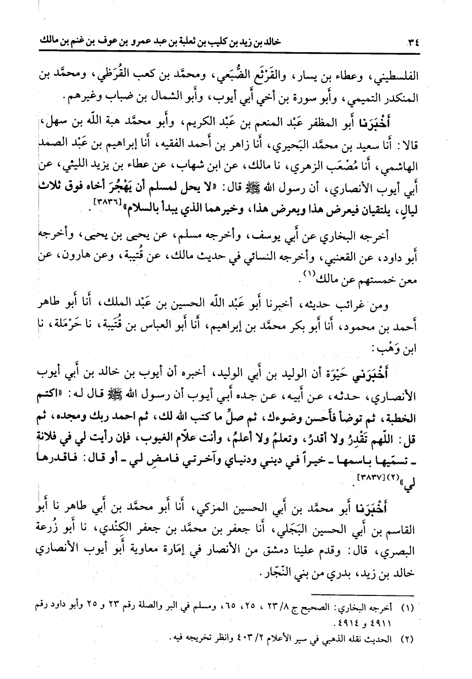 الفلسطيني وعطاء بن يسار والقرثع الضبعي ومحمد بن كعب القرظي ومحمد بن المنكدر التميمي وأبو سورة بن أخي أبي أيوب وأبو الشمال بن ضباب وغيرهم أخبرنا أبو المظفر عبد المنعم بن عبد الكريم وأبو محمد هبة الله بن سهل قالا أنا سعيد بن محمد البحيري أنا زاهر بن أحمد الفقيه أنا إبراهيم بن عبد الصمد الهاشمي أنا مصعب الزهري نا مالك عن ابن شهاب عن عطاء بن يزيد الليثي عن أبي أيوب الأنصاري أن رسول الله (صلى الله عليه وسلم) قال لا يحل لمسلم أن يهجر أخاه فوق ثلاث ليال يلتقيان فيعرض هذا ويعرض هذا وخيرهما الذي يبدأ بالسلام أخرجه البخاري عن أبي يوسف وأخرجه مسلم عن يحيى بن يحيى وأخرجه أبو داود عن القعنبي وأخرجه النسائي في حديث مالك عن قتيبة وعن هارون عن معن خمستهم عن مالك (1) ومن غرائب حديثه أخبرنا أبو عبد الله الحسين بن عبد الملك أنا أبو طاهر أحمد بن محمود أنا أبو بكر محمد بن إبراهيم أنا أبو العباس بن قتيبة نا حرملة نا ابن وهب أخبرني حيوة أن الوليد بن أبي الوليد أخبره أن أيوب بن خالد بن أبي أيوب الأنصاري حدثه عن أبيه عن جده أبي أيوب أن رسول الله (صلى الله عليه وسلم) قال له اكتم الخطبة ثم توضأ فأحسن وضوءك ثم صل ما كتب الله لك ثم احمد ربك ومجده ثم قل اللهم تقدر ولا أقدر وتعلم ولا أعلم وأنت علام الغيوب فإن رأيت لي في فلانة تسميها باسمها خيرا في ديني ودنياي وآخرتي فامض لي أو قال فاقدرها لي (2) أخبرنا أبو محمد بن أبي الحسين المزكي أنا أبو محمد بن أبي طاهر نا أبو القاسم بن أبي الحسين البجلي أنا جعفر بن محمد بن جعفر الكندي نا أبو زرعة البصري قال وقدم علينا دمشق من الأنصار في إمارة معاوية أبو أيوب الأنصاري خالد بن زيد بدري من بني النجار