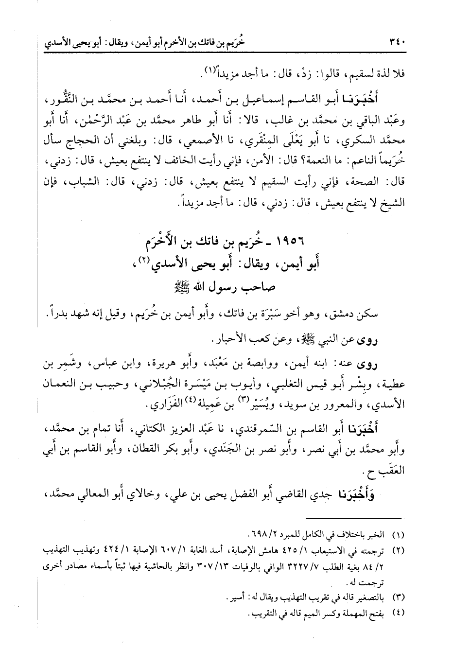1956 - خريم بن فاتك بن الأخرم أبو أيمن ويقال أبو يحيى الأسدي (2) صاحب رسول الله (ص) سكن دمشق وهو أخو سبرة بن فاتك وأبو أيمن بن خريم وقيل إنه شهد بدرا روى عن النبي (صلى الله عليه وسلم) وعن كعب الأحبار روى عنه ابنه أيمن ووابصة بن معبد وأبو هريرة وابن عباس وشمر بن عطية وبشر أبو قيس التغلبي وأيوب بن ميسرة الجبلاني وحبيب بن النعمان الأسدي والمعرور بن سويد ويسير (3) بن عميلة (4) الفزاري أخبرنا أبو القاسم بن السمرقندي نا عبد العزيز الكتاني أنا تمام بن محمد وأبو محمد بن أبي نصر وأبو نصر بن الجندي وأبو بكر القطان وأبو القاسم بن أبي العقب وأخبرنا جدي القاضي أبو الفضل يحيى بن علي وخالاي أبو المعالي محمد