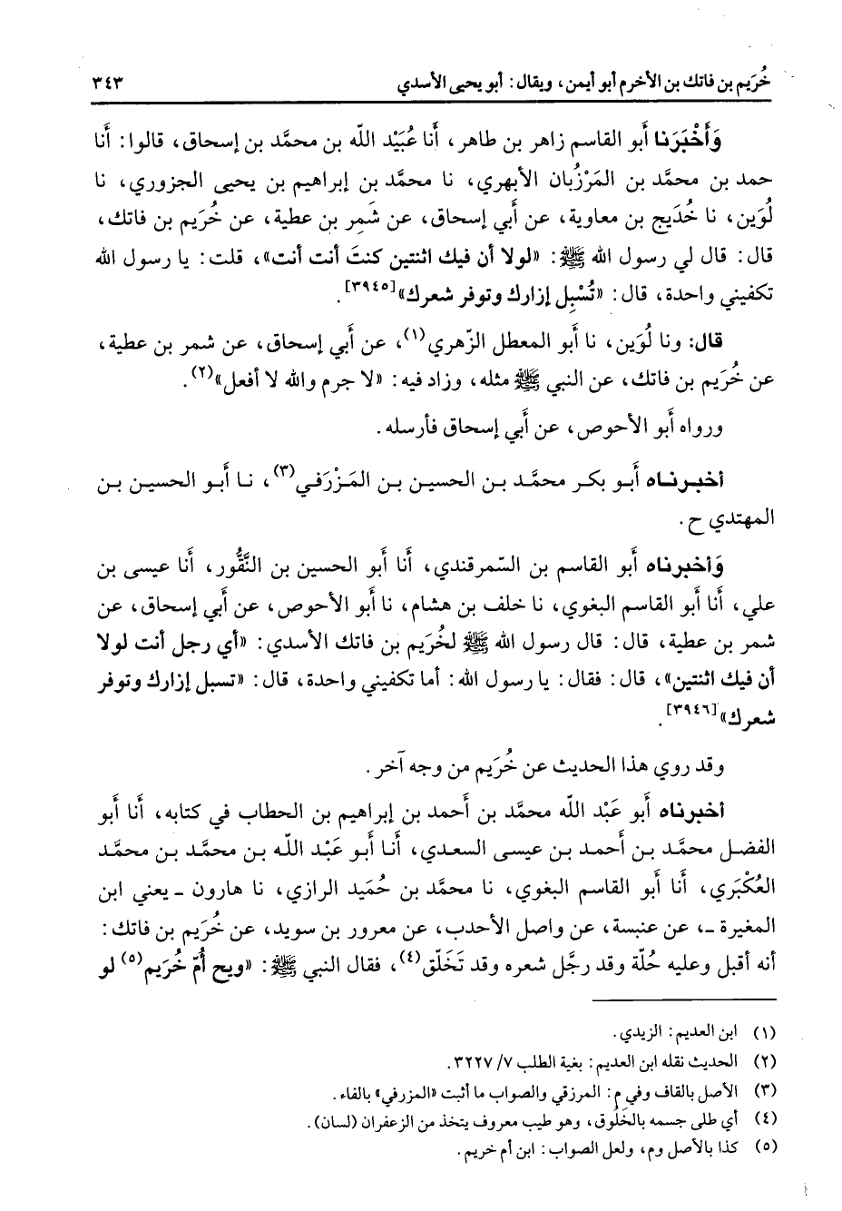 وأخبرنا أبو القاسم زاهر بن طاهر أنا عبيد الله بن محمد بن إسحاق قالوا أنا حمد بن محمد بن المرزبان الأبهري نا محمد بن إبراهيم بن يحيى الجزوري نا لوين نا خديج بن معاوية عن أبي إسحاق عن شمر بن عطية عن خريم بن فاتك قال قال لي رسول الله (صلى الله عليه وسلم) لولا أن فيك اثنتين كنت أنت أنت قلت يا رسول الله تكفيني واحدة قال تسبل إزارك وتوفر شعرك قال ونا لوين نا أبو المعطل الزهري (1) عن أبي إسحاق عن شمر بن عطية عن خريم بن فاتك عن النبي (صلى الله عليه وسلم) مثله وزاد فيه لا جرم والله لأفعل ورواه أبو الأحوص عن أبي إسحاق فأرسله أخبرناه أبو بكر محمد بن الحسين بن المزرفي (3) نا أبو الحسين بن المهتدي وأخبرناه أبو القاسم بن السمرقندي أنا أبو الحسين بن النقور أنا عيسى بن علي أنا أبو القاسم البغوي نا خلف بن هشام نا أبو الأحوص عن أبي إسحاق عن شمر بن عطية قال قال رسول الله (صلى الله عليه وسلم) لخريم بن فاتك الأسدي أي رجل أنت لولا أن فيك اثنتين قال فقال يا رسول الله أما تكفيني واحدة قال تسبل إزارك وتوفر شعرك وقد روى هذا الحديث عن خريم من وجه آخر أخبرناه أبو عبد الله محمد بن أحمد بن إبراهيم بن الحطاب في كتابه أنا أبو الفضل محمد بن أحمد بن عيسى السعدي أنا أبو عبد الله بن محمد بن محمد العكبري أنا أبو القاسم البغوي نا محمد بن حميد الرازي نا هارون يعني ابن المغيرة عن عنبسة عن واصل الأحدب عن معرور بن سويد عن خريم بن فاتك أنه أقبل وعليه حلة وقد رجل شعره وقد تخلق (4) فقال النبي (صلى الله عليه وسلم) ويح أم خريم (5) لو