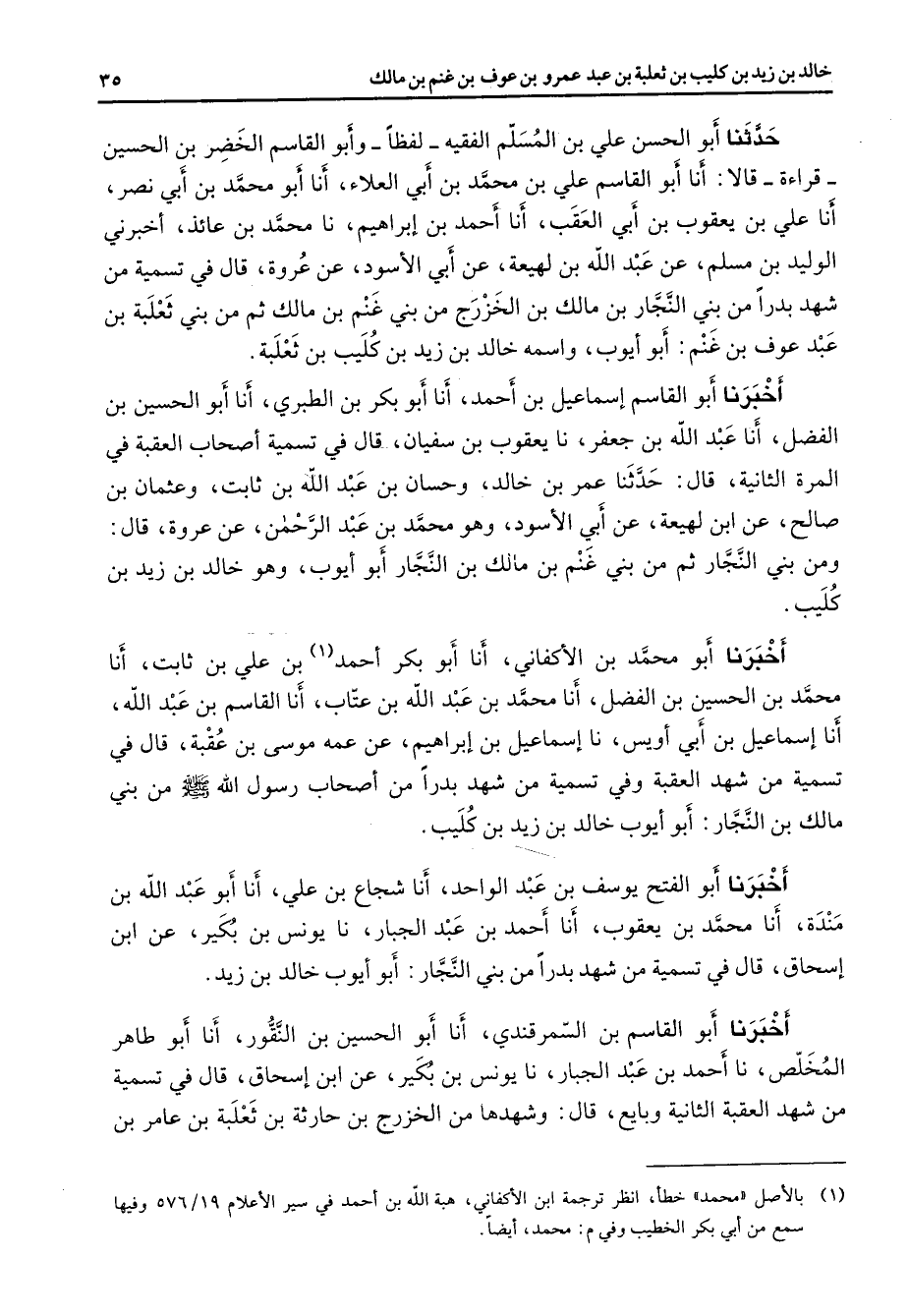 أنا علي بن يعقوب بن أبي العقب أنا أحمد بن إبراهيم نا محمد بن عائذ أخبرني الوليد بن مسلم عن عبد الله بن لهيعة عن أبي الأسود عن عروة قال في تسمية من شهد بدرا من بني النجار بن مالك بن الخزرج من بني غنم بن مالك ثم من بني ثعلبة بن عبد عوف بن غنم أبو أيوب واسمه خالد بن زيد بن كليب بن ثعلبة أخبرنا أبو القاسم إسماعيل بن أحمد أنا أبو بكر بن الطبري أنا أبو الحسين بن الفضل أنا عبد الله بن جعفر نا يعقوب بن سفيان قال في تسمية أصحاب العقبة في المرة الثانية قال حدثنا عمر بن خالد وحسان بن عبد الله بن ثابت وعثمان بن صالح عن ابن لهيعة عن أبي الأسود وهو محمد بن عبد الرحمن عن عروة قال ومن بني النجار ثم من بني غنم بن مالك بن النجار أبو أيوب وهو خالد بن زيد بن كليب أخبرنا أبو محمد بن الأكفاني أنا أبو بكر أحمد (1) بن علي بن ثابت أنا محمد بن الحسين بن الفضل أنا محمد بن عبد الله بن عتاب أنا القاسم بن عبد الله أنا إسماعيل بن أبي أويس نا إسماعيل بن إبراهيم عن عمه موسى بن عقبة قال في تسمية من شهد العقبة وفي تسمية من شهد بدرا من أصحاب رسول الله (صلى الله عليه وسلم) من بني مالك بن النجار أبو أيوب خالد بن زيد بن كليب أخبرنا أبو الفتح يوسف بن عبد الواحد أنا شجاع بن علي أنا أبو عبد الله بن مندة أنا محمد بن يعقوب أنا أحمد بن عبد الجبار نا يونس بن بكير عن ابن إسحاق قال في تسمية من شهد بدرا من بني النجار أبو أيوب خالد بن يزيد أخبرنا أبو القاسم بن السمرقندي أنا أبو الحسين بن النقور أنا أبو طاهر المخلص نا أحمد بن عبد الجبار نا يونس بن بكير عن ابن إسحاق قال في تسمية من شهد العقبة الثانية وبايع قال وشهدها من الخزرج بن حارثة بن ثعلبة بن عامر بن