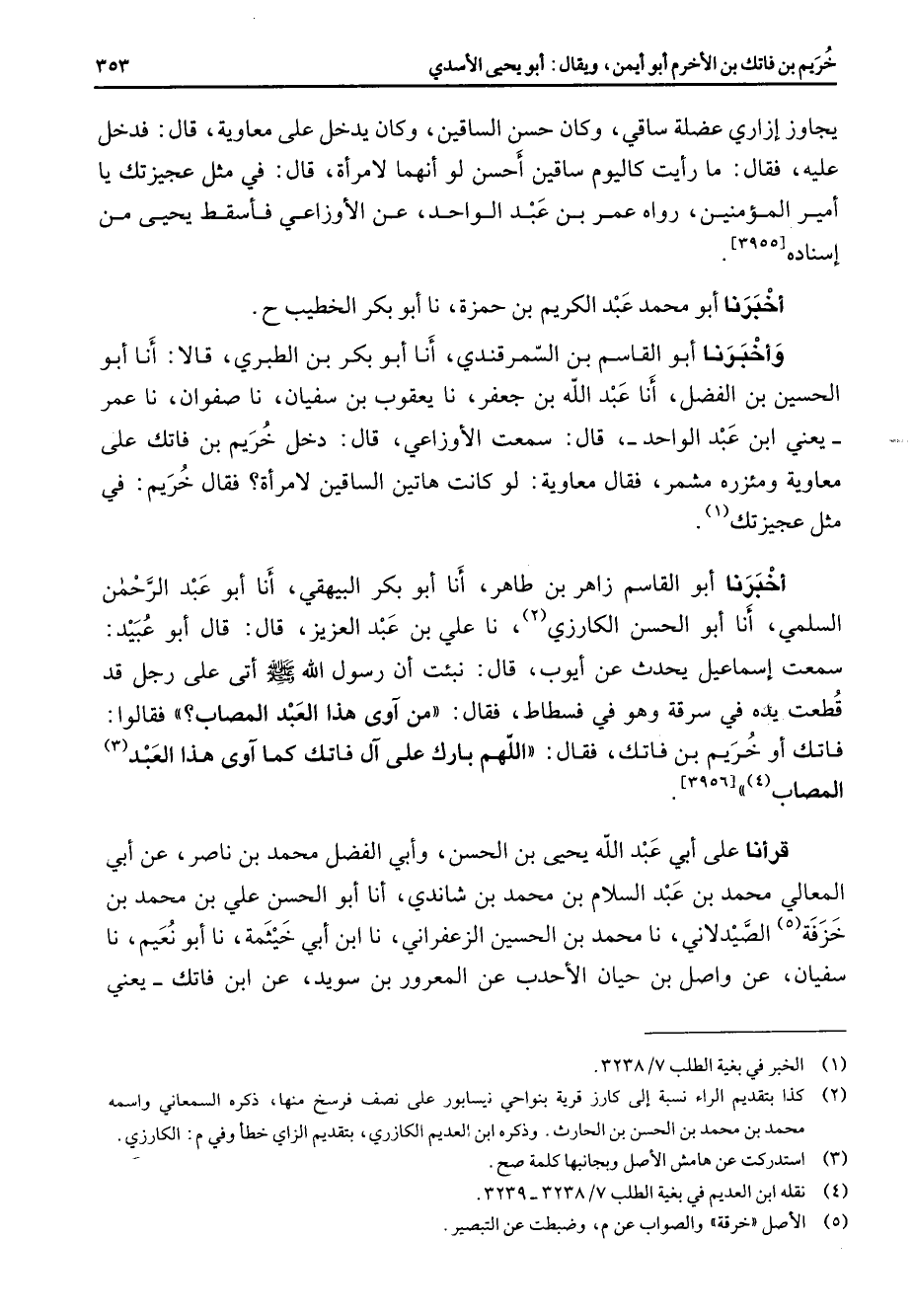 يجاوز إزاري عضلة ساقي وكان حسن الساقين وكان يدخل على معاوية قال فدخل عليه فقال ما رأيت كاليوم ساقين أحسن لو أنهما لامرأة قال في مثل عجيزتك يا أمير المؤمنين رواه عمر بن عبد الواحد عن الأوزاعي فأسقط يحيى من إسناده أخبرنا أبو محمد عبد الكريم بن حمزة نا أبو بكر الخطيب وأخبرنا أبو القاسم بن السمرقندي أنا أبو بكر بن الطبري قالا أنا أبو الحسين بن الفضل أنا عبد الله بن جعفر نا يعقوب بن سفيان نا صفوان نا عمر يعني ابن عبد الواحد قال سمعت الأوزاعي قال دخل خريم بن فاتك على معاوية ومئزره مشمر فقال معاوية لو كانت هاتين الساقين لامرأة فقال خريم في مثل عجيزتك (1) أخبرنا أبو القاسم زاهر بن طاهر أنا أبو بكر البيهقي أنا أبو عبد الرحمن السلمي أنا أبو الحسن الكارزي (2) نا علي بن عبد العزيز قال قال أبو عبيد سمعت إسماعيل يحدث عن أيوب قال نبئت أن رسول الله (صلى الله عليه وسلم) أتى على رجل قد قطعت يده في سرقة وهو في فسطاط فقال من آوى هذا العبد المصاب فقالوا فاتك أو خريم بن فاتك فقال اللهم بارك - على آل فاتك كما آوى هذا العبد (3) المصاب (4) قرأنا على أبي عبد الله يحيى بن الحسن وأبي الفضل محمد بن ناصر عن أبي المعالي محمد بن عبد السلام بن محمد بن شاندي أنا أبو الحسن علي بن محمد بن خزفة (5) الصيدلاني نا محمد بن الحسين الزعفراني نا ابن أبي خيثمة نا أبو نعيم نا سفيان عن واصل بن حيان الأحدب عن المعرور بن سويد عن ابن فاتك يعني