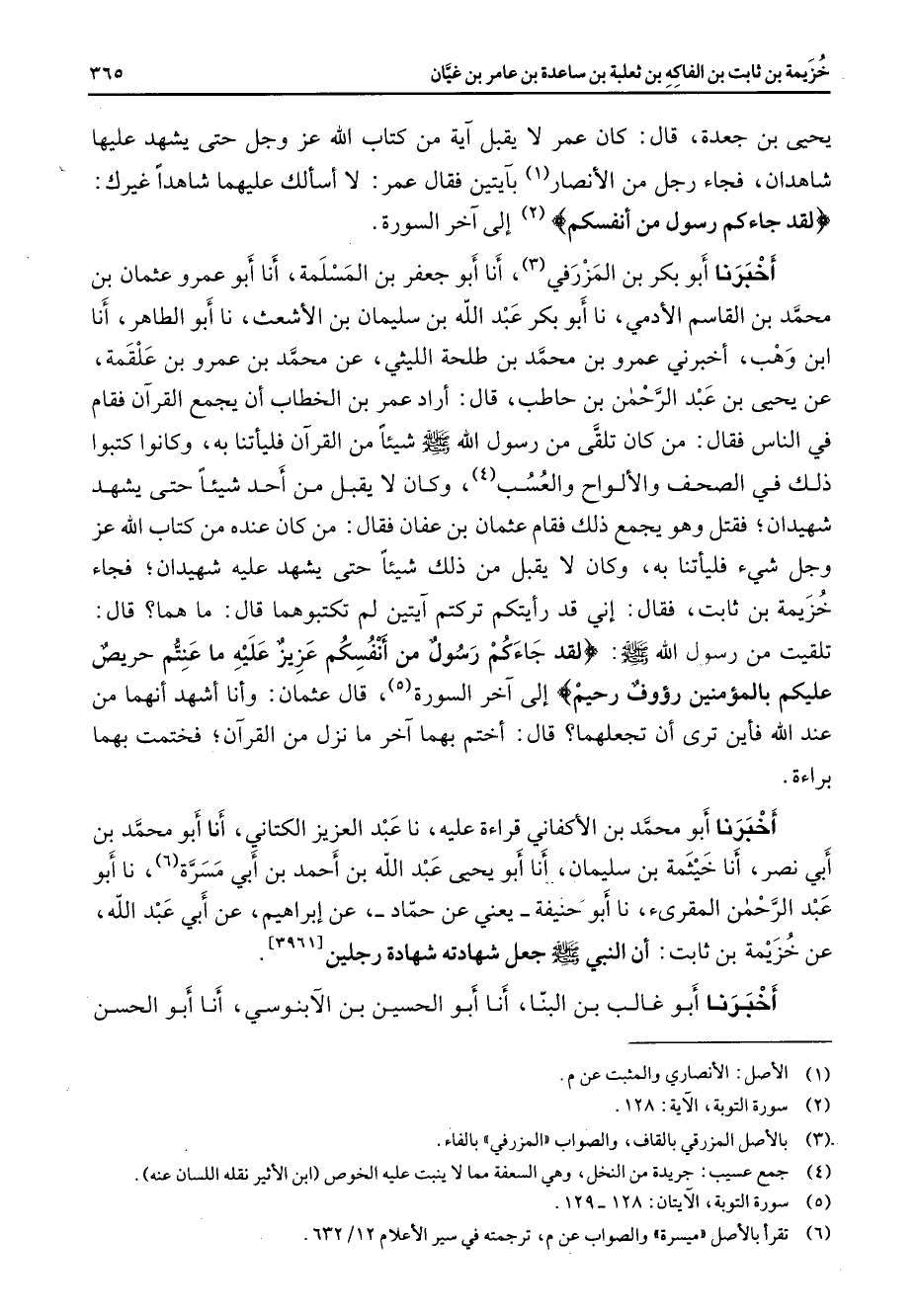 يحيى بن جعدة قال كان عمر لا يقبل آية من كتاب الله عز وجل حتى يشهد عليها شاهدان فجاء رجل من الأنصار (1) بآيتين فقال عمر لا أسألك عليهما شاهدا غيرك " لقد جاءكم رسول من أنفسكم " (2) إلى آخر السورة أخبرنا أبو بكر بن المزرفي (3) أنا أبو جعفر بن المسلمة أنا أبو عمرو عثمان بن محمد بن القاسم الأدمي نا أبو بكر عبد الله بن سليمان بن الأشعث نا أبو الطاهر أنا ابن وهب أخبرني عمرو بن محمد بن طلحة الليثي عن محمد بن عمرو بن علقمة عن يحيى بن عبد الرحمن بن حاطب قال أراد عمر بن الخطاب أن يجمع القرآن فقام في الناس فقال من كان تلقى من رسول الله (صلى الله عليه وسلم) شيئا من القرآن فليأتنا به وكانوا كتبوا ذلك في الصحف والألواح والعسب (4) وكان لا يقبل من أحد شيئا حتى يشهد شهيدان فقتل وهو يجمع ذلك فقام عثمان بن عفان فقال من كان عنده من كتاب الله عز وجل شئ فليأتنا به وكان لا يقبل من ذلك شيئا حتى يشهد عليه شهيدان فجاء خزيمة بن ثابت فقال إني قد رأيتكم تركتم آيتين لم تكتبوهما قال ما هما قال تلقيت من رسول الله (صلى الله عليه وسلم) " لقد جاءكم رسول من أنفسكم عزيز عليه ما عنتم حريص عليكم بالمؤمنين رؤوف رحيم " إلى آخر السورة (5) قال عثمان وأنا أشهد أنهما من عند الله فأين ترى أن تجعلهما قال أختم بهما آخر ما نزل من القرآن فختمت بهما براءة أخبرنا أبو محمد بن الأكفاني قراءة عليه نا عبد العزيز الكتاني أنا أبو محمد بن أبي نصر أنا خيثمة بن سليمان أنا أبو يحيى عبد الله بن أحمد بن أبي مسرة (6) نا أبو عبد الرحمن المقرئ نا أبو حنيفة يعني عن حماد عن إبراهيم عن أبي عبد الله عن خزيمة بن ثابت أن النبي (صلى الله عليه وسلم) جعل شهادته شهادة رجلين أخبرنا أبو غالب بن البنا أنا أبو الحسين بن الآبنوسي أنا أبو الحسن