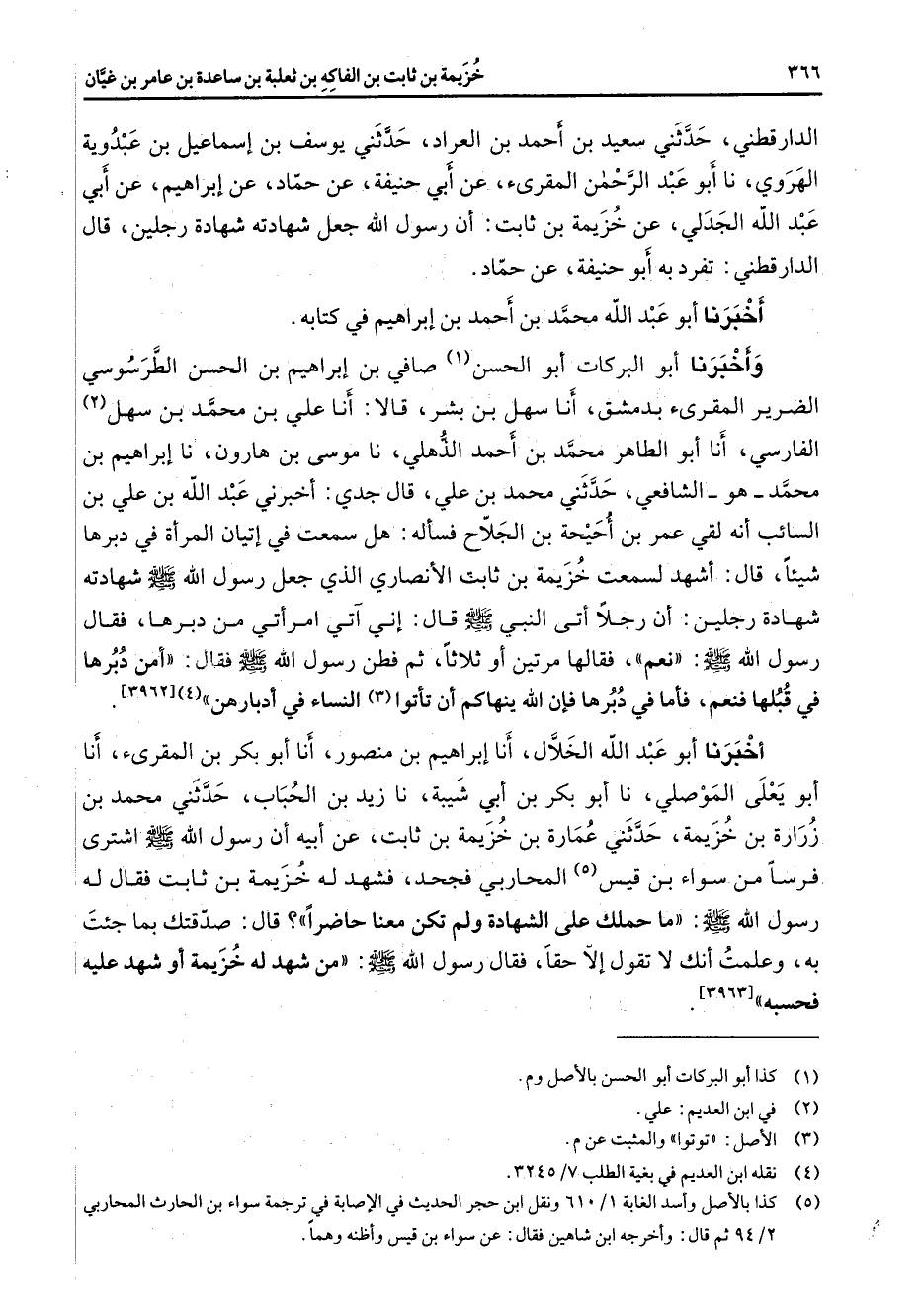 الدارقطني حدثني سعيد بن أحمد بن العراد حدثني يوسف بن إسماعيل بن عبدوية الهروي نا أبو عبد الرحمن المقرئ عن أبي حنيفة عن حماد عن إبراهيم عن أبي عبد الله الجدلي عن خزيمة بن ثابت أن رسول الله جعل شهادته شهادة رجلين قال الدارقطني تفرد به أبو حنيفة عن حماد أخبرنا أبو عبد الله محمد بن أحمد بن إبراهيم في كتابه وأخبرنا أبو البركات أبو الحسن (1) صافي بن إبراهيم بن الحسن الطرسوسي الضرير المقرئ بدمشق أنا سهل بن بشر قالا أنا علي بن محمد بن سهل (2) الفارسي أنا أبو الطاهر محمد بن أحمد الذهلي نا موسى بن هارون نا إبراهيم بن محمد هو الشافعي حدثني محمد بن علي قال جدي أخبرني عبد الله بن علي بن السائب أنه لقي عمر بن أحيحة بن الجلاح فسأله هل سمعت في إتيان المرأة في دبرها شيئا قال أشهد لسمعت خزيمة بن ثابت الأنصاري الذي جعل رسول الله (صلى الله عليه وسلم) شهادته شهادة رجلين أن رجلا أتى النبي (صلى الله عليه وسلم) قال إني آتي امرأتي من دبرها فقال رسول الله (صلى الله عليه وسلم) نعم فقالها مرتين أو ثلاثا ثم فطن رسول الله (صلى الله عليه وسلم) فقال أمن دبرها في قبلها فنعم فأما في دبرها فإن الله ينهاكم أن تأتوا (3) النساء في أدبارهن (4) أخبرنا أبو عبد الله الخلال أنا إبراهيم بن منصور أنا أبو بكر بن المقرئ أنا أبو يعلى الموصلي نا أبو بكر بن أبي شيبة نا زيد بن الحباب حدثني محمد بن زرارة بن خزيمة حدثني عمارة بن خزيمة بن ثابت عن أبيه أن رسول الله (صلى الله عليه وسلم) اشترى فرسا من سواء بن قيس (5) المحاربي فجحد فشهد له خزيمة بن ثابت فقال له رسول الله (صلى الله عليه وسلم) ما حملك على الشهادة ولم تكن معنا حاضرا قال صدقتك بما جئت به وعلمت أنك لا تقول إلا حقا فقال رسول الله (صلى الله عليه وسلم) من شهد له خزيمة أو شهد عليه فحسبه