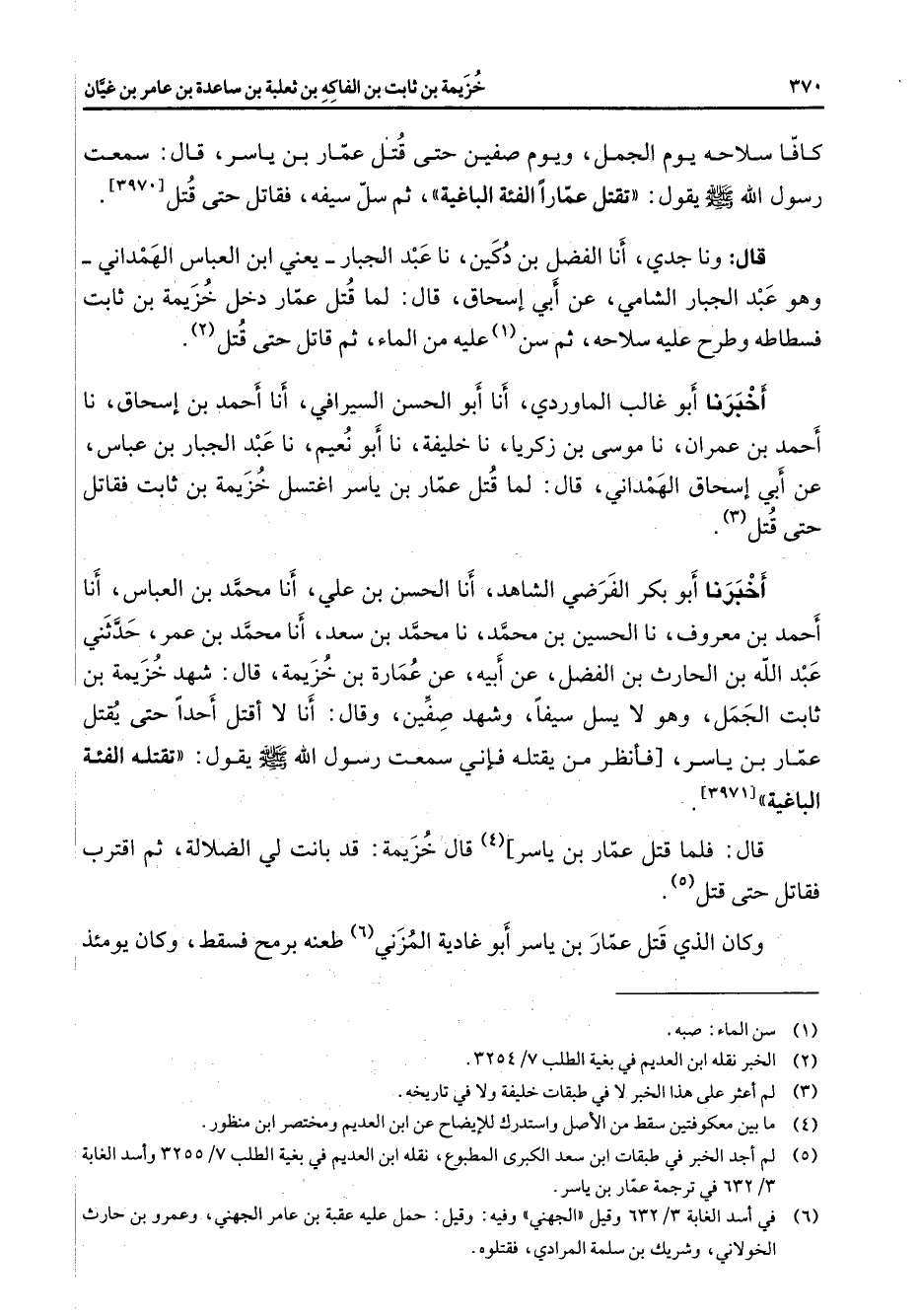 (5) لم أجد الخبر في طبقات ابن سعد الكبرى المطبوع نقله ابن العديم في بغية الطلب 7 / 3255 وأسد الغابة 3 / 632 في ترجمة عمار بن ياسر