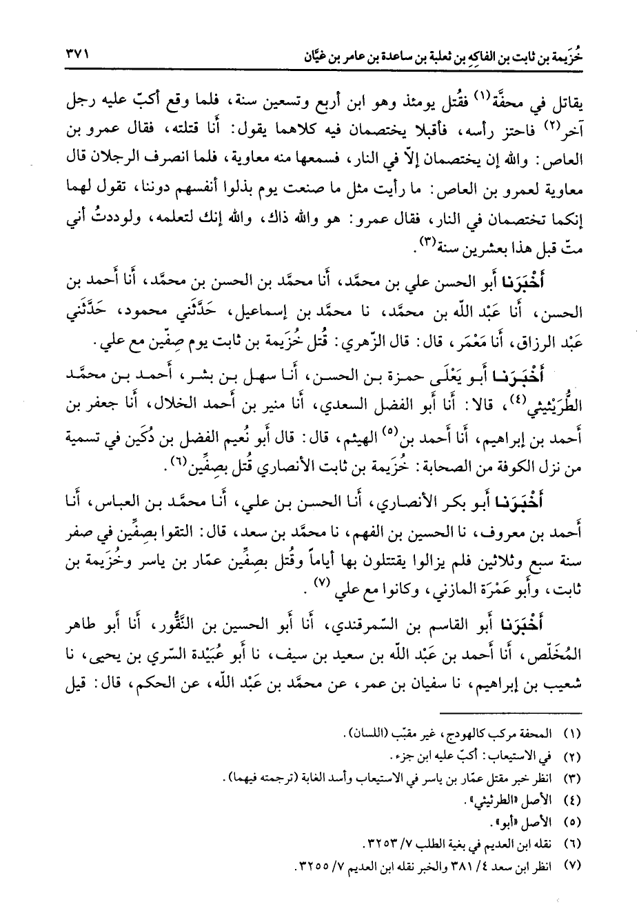 يقاتل في محفة (1) فقتل يومئذ وهو ابن أربع وتسعين سنة فلما وقع أكب عليه رجل آخر (2) فاحتز رأسه فأقبلا يختصمان فيه كلاهما يقول أنا قتلته فقال عمرو بن العاص والله إن يختصمان إلا في النار فسمعها منه معاوية فلما انصرف الرجلان قال معاوية لعمرو بن العاص ما رأيت مثل ما صنعت يوم بذلوا أنفسهم دوننا تقول لهما إنكما تختصمان في النار فقال عمرو هو والله ذاك والله إنك لتعلمه ولوددت إني مت قبل هذا بعشرين سنة (3) أخبرنا أبو الحسن علي بن محمد أنا محمد بن الحسن بن محمد أنا أحمد بن الحسن أنا عبد الله بن محمد نا محمد بن إسماعيل حدثني محمود حدثني عبد الرزاق أنا معمر قال قال الزهري قتل خزيمة بن ثابت يوم صفين مع علي أخبرنا أبو يعلى حمزة بن الحسن أنا سهل بن بشر أحمد بن محمد الطريثيثي (4) قالا أنا أبو الفضل السعدي أنا منير بن أحمد الخلال أنا جعفر بن أحمد بن إبراهيم أنا أحمد بن (5) الهيثم قال قال أبو نعيم الفضل بن دكين في تسمية من نزل الكوفة من الصحابة خزيمة بن ثابت الأنصاري قتل بصفين (6) أخبرنا أبو بكر الأنصاري أنا الحسن بن علي أنا محمد بن العباس أنا أحمد بن معروف نا الحسين بن الفهم نا محمد بن سعد قال التقوا بصفين في صفر سنة سبع وثلاثين فلم يزالوا يقتتلون بها أياما وقتل بصفين عمار بن ياسر وخزيمة بن ثابت وأبو عمرة المازني وكانوا مع علي (7) أخبرنا أبو القاسم بن السمرقندي أنا أبو الحسين بن النقور أنا أبو طاهر المخلص أنا أحمد بن عبد الله بن سعيد بن سيف نا أبو عبيدة السري بن يحيى نا شعيب بن إبراهيم نا سفيان بن عمر عن محمد بن عبد الله عن الحكم قال قيل