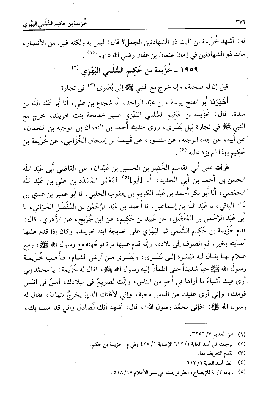 1959 - خزيمة بن حكيم السلمي البهزي (2) قيل إن له صحبة وأنه خرج مع النبي (صلى الله عليه وسلم) إلى بصرى (3) في تجارة أخبرنا أبو الفتح يوسف بن عبد الواحد أنا شجاع بن علي أنا أبو عبد الله بن مندة قال خزيمة بن حكيم السلمي البهزي صهر خديجة بنت خويلد خرج مع النبي (صلى الله عليه وسلم) في تجارة قبل بصرى روى حديثه أحمد بن النعمان بن الوجيه بن النعمان عن أبيه عن جده الوجيه عن منصور عن قبيصة بن إسحاق الخزاعي عن خزيمة بن حكيم بهذا لم يزد عليه (4) قرأت على أبي القاسم الخضر بن الحسين بن عبدان عن القاضي أبي عبد الله الحسن بن أحمد بن أبي الحديد أنا أبو (5) المعمر المسدد بن علي بن عبد الله الحمصي أنا أبو بكر أحمد بن عبد الكريم بن يعقوب الحلبي نا أبو عمير بن عدي بن عبد الباقي نا عبد الله بن إسماعيل نا أحمد بن عبد الرحمن بن المفضل الحراني نا أبي عبد الرحمن بن المفضل عن عبيد بن حكيم عن ابن جريج عن الزهري قال قدم خزيمة بن حكيم السلمي ثم البهزي على خديجة ابنة خويلد وكان إذا قدم عليها أصابته بخير ثم انصرف إلى بلاده وإنه قدم عليها مرة فوجهته مع رسول الله (صلى الله عليه وسلم) ومع غلام لها يقال له ميسرة إلى بصرى وبصرى من أرض الشام فأحب خزيمة رسول الله (صلى الله عليه وسلم) حبا شديدا حتى اطمأن إليه رسول الله (صلى الله عليه وسلم) فقال له خزيمة يا محمد إني أرى فيك أشياء ما أراها في أحد من الناس وإنك لصريح في ميلادك أمين في أنفس قومك وإني أرى عليك من الناس محبة وإني لأظنك الذي يخرج بتهامة فقال له رسول الله (صلى الله عليه وسلم) فإني محمد رسول الله قال أشهد أنك لصادق وإني قد آمنت بك