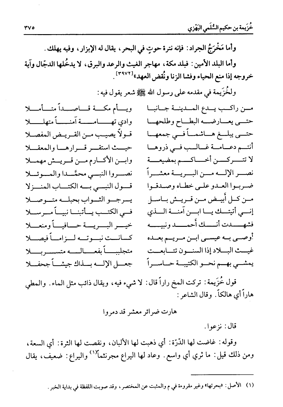 وأما مخرج الجراد فإنه نترة حوت في البحر يقال له الإبزاز وفيه يهلك وأما البلد الأمين فبلد مكة مهاجر الغيث والرعد والبرق لا يدخلها الدجال وآية خروجه إذا منع الحياء وفشا الزنا ونقض العهد ولخزيمة في مقدمه على رسول الله (صلى الله عليه وسلم) شعر يقول فيه من راكب يدع المدينة جانبا * ويأم مكة قاصدا متأملا حتى يعارضه البطاح وطلحها * وادي تهامة آمنا متهللا حتى يبلغ هاشما في جمعها * قولا يصيب من القريض المفصلا أنتم دعامة غالب في ذروها * حيث استقر قرارها والمعقلا لا تتركن أخاكم بمضيعة * وابن الأكارم من قريش مهملا نصر الإله من البرية معشرا * نصروا النبي محمدا والموئلا ضربوا العدو على خطاه وصدقوا * قول النبي به الكتاب المنزلا من كل أبيض من قريش باسل * يرجو الثواب بحبله متوصلا إني أتيتك يا ابن آمنة الذي * في الكتب يأتينا نبيا مرسلا فشهدت أنك أحمد ونبيه * خير البرية حافيا ومنعلا أوصى به عيسى ابن مريم بعده * كانت نبوته لزاما فيصلا غيث البلاد إذا السنون تتابعت * متجلببا بفعاله متسربلا يمشي بهم نحو الكتيبة حاسرا * جعل الإله بذاك جيشا جحفلا * قول خزيمة تركت المخ رارا قال لا شئ فيه ويقال ذائب مثل الماء والمطي هارا أي هالكا وقال الشاعر هارت ضرائر معشر قد دمروا قال نزعوا وقوله غاضت لها الدرة أي ذهبت لها الألبان ونقصت لها الثرة أي السعة ومن ذلك قيل ما ثري أي واسع وعاد لها اليراع مجرنثما (1) واليراع ضعيف يقال