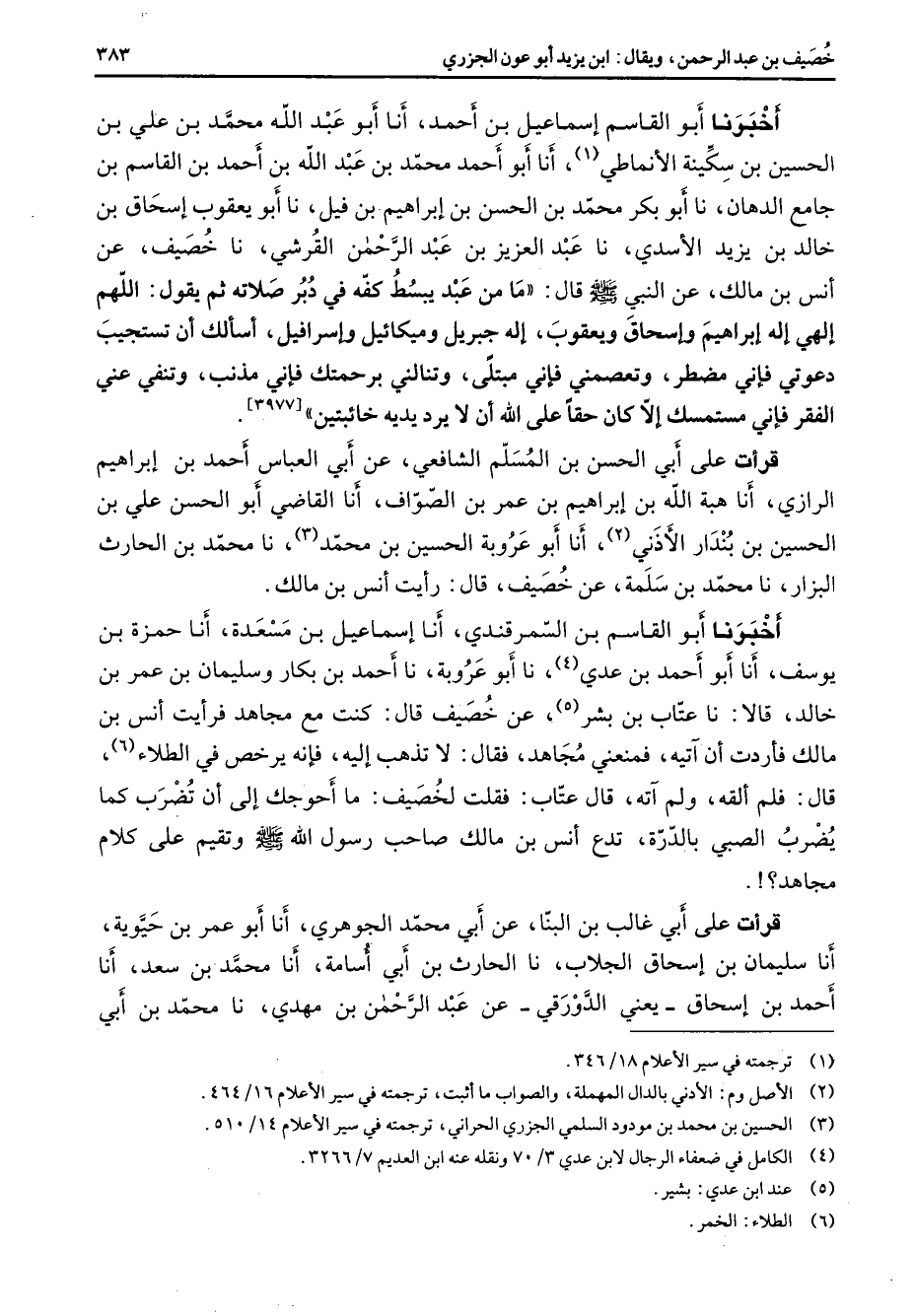 أخبرنا أبو القاسم إسماعيل بن أحمد أنا أبو عبد الله محمد بن علي بن الحسين بن سكينة الأنماطي (1) أنا أبو أحمد محمد بن عبد الله بن أحمد بن القاسم بن جامع الدهان نا أبو بكر محمد بن الحسن بن إبراهيم بن فيل نا أبو يعقوب إسحاق بن خالد بن يزيد الأسدي نا عبد العزيز بن عبد الرحمن القرشي نا خصيف عن أنس بن مالك عن النبي (صلى الله عليه وسلم) قال ما من عبد يبسط كفه في دبر صلاته ثم يقول اللهم إلهي إله إبراهيم وإسحاق ويعقوب إله جبريل وميكائيل وإسرافيل أسألك أن تستجيب دعوتي فإني مضطر وتعصمني فإني مبتلى وتنالني برحمتك فإني مذنب وتنفي عني الفقر فإني مستمسك إلا كان حقا على الله أن لا يرد يديه خائبتين قرأت على أبي الحسن بن المسلم الشافعي عن أبي العباس أحمد بن إبراهيم الرازي أنا هبة الله بن إبراهيم بن عمر بن الصواف أنا القاضي أبو الحسن علي بن الحسين بن بندار الأذني (2) أنا أبو عروبة الحسين بن محمد (3) نا محمد بن الحارث البزار نا محمد بن سلمة عن خصيف قال رأيت أنس بن مالك أخبرنا أبو القاسم بن السمرقندي أنا إسماعيل بن مسعدة أنا حمزة بن يوسف أنا أبو أحمد بن عدي (4) نا أبو عروبة نا أحمد بن بكار وسليمان بن عمر بن خالد قالا نا عتاب بن بشر (5) عن خصيف قال كنت مع مجاهد فرأيت أنس بن مالك فأردت أن آتيه فمنعني مجاهد فقال لا تذهب إليه فإنه يرخص في الطلاء (6) قال فلم ألقه ولم آته قال عتاب فقلت لخصيف ما احوجك إلى أن تضرب كما يضرب الصبي بالدرة تدع أنس بن مالك صاحب رسول الله (صلى الله عليه وسلم) وتقيم على كلام مجاهد قرأت على أبي غالب بن البنا عن أبي محمد الجوهري أنا أبو عمر بن حيوية أنا سليمان بن إسحاق الجلاب نا الحارث بن أبي أسامة أنا محمد بن سعد أنا أحمد بن إسحاق يعني الدورقي عن عبد الرحمن بن مهدي نا محمد بن أبي