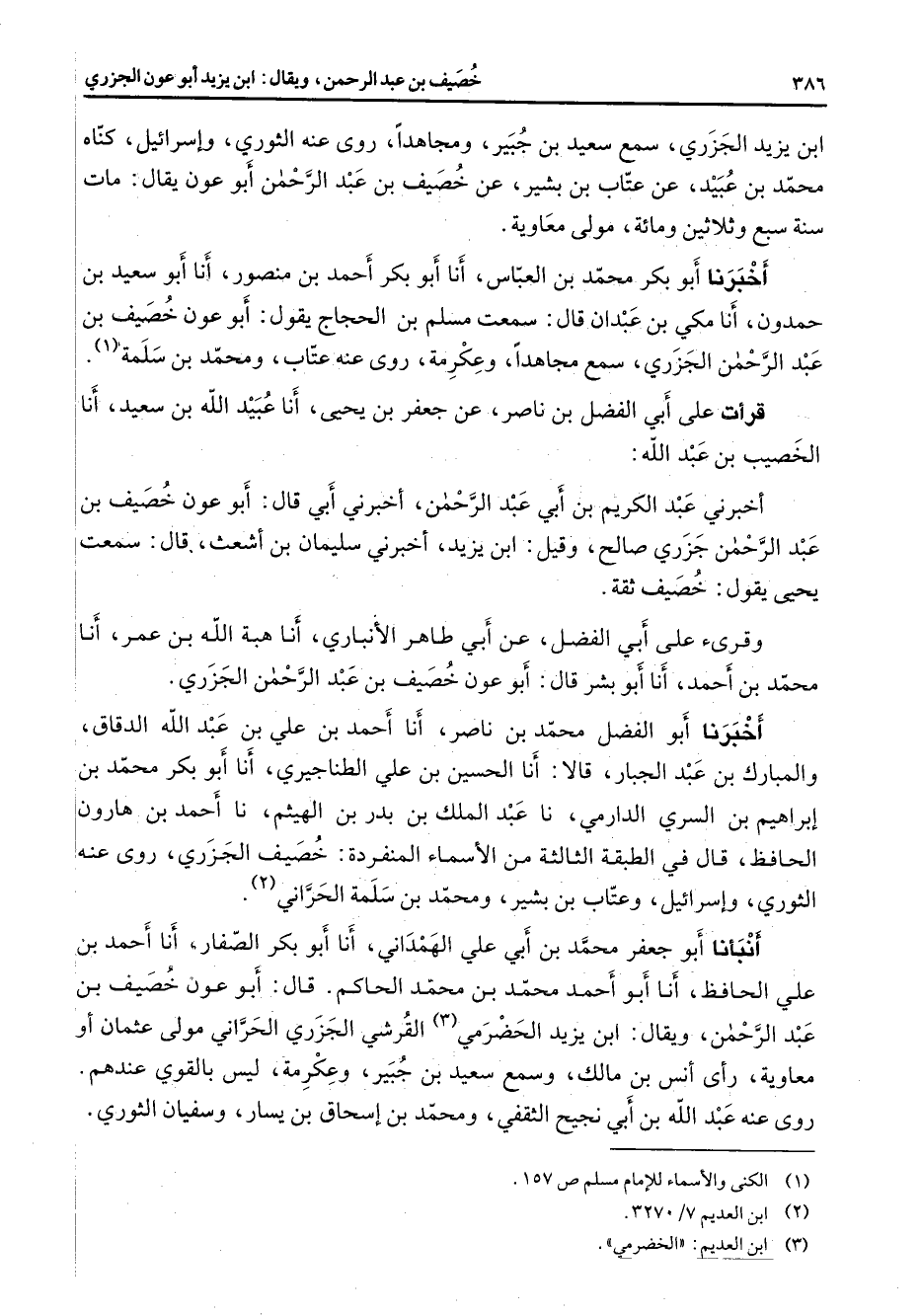 ابن يزيد الجزري سمع سعيد بن جبير ومجاهدا روى عنه الثوري وإسرائيل كناه محمد بن عبيد عن عتاب بن بشير عن خصيف بن عبد الرحمن أبو عون يقال مات سنة سبع وثلاثين ومائة مولى معاوية أخبرنا أبو بكر محمد بن العباس أنا أبو بكر أحمد بن منصور أنا أبو سعيد بن حمدون أنا مكي بن عبدان قال سمعت مسلم بن الحجاج يقول أبو عون خصيف بن عبد الرحمن الجزري سمع مجاهدا وعكرمة روى عنه عتاب ومحمد بن سلمة (1) قرأت على أبي الفضل بن ناصر عن جعفر بن يحيى أنا عبيد الله بن سعيد أنا الخصيببن عبد الله أخبرني عبد الكريم بن أبي عبد الرحمن أخبرني أبي قال أبو عون خصيف بن عبد الرحمن جزري صالح وقيل ابن يزيد أخبرني سليمان بن أشعث قال سمعت يحيى يقول خصيف ثقة وقرئ على أبي الفضل عن أبي طاهر الأنباري أنا هبة الله بن عمر أنا محمد بن أحمد أنا أبو بشر قال أبو عون خصيف بن عبد الرحمن الجزري أخبرنا أبو الفضل محمد بن ناصر أنا أحمد بن علي بن عبد الله الدقاق والمبارك بن عبد الجبار قالا أنا الحسين بن علي الطناجيري أنا أبو بكر محمد بن إبراهيم بن السري الدارمي نا عبد الملك بن بدر بن الهيثم نا أحمد بن هارون الحافظ قال في الطبقة الثالثة من الأسماء المنفردة خصيف الجزري روى عنه الثوري وإسرائيل وعتاب بن بشير ومحمد بن سلمة الحراني (2) أنبأنا أبو جعفر محمد بن أبي علي الهمداني أنا أبو بكر الصفار أنا أحمد بن علي الحافظ أنا أبو أحمد محمد بن محمد الحاكم قال أبو عون خصيف بن عبد الرحمن ويقال ابن يزيد الحضرمي (3) القرشي الجزري الحراني مولى عثمان أو معاوية رأى أنس بن مالك وسمع سعيد بن جبير وعكرمة ليس بالقوي عندهم روى عنه عبد الله بن أبي نجيح الثقفي ومحمد بن إسحاق بن يسار وسفيان الثوري