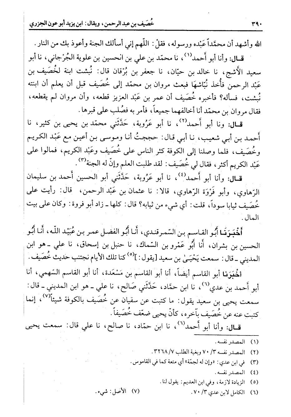 الله وأشهد أن محمدا عبده ورسوله فقل اللهم إني أسألك الجنة وأعوذ بك من النار قال وأنا أبو أحمد (1) نا محمد بن علي بن الحسين بن علوية الجرجاني نا أبو سعيد الأشج نا خالد بن حيان نا جعفر بن برقان قال نبشت ابنة لخصيف بن عبد الرحمن فأخذ نباشها فبعث مروان بن محمد إلى خصيف قبل أن يعلم أن ابنته نبشت فسأله فأخبره خصيف أن عمر بن عبد العزيز قطعه وأن مروان لم يقطعه فقال مروان بن محمد أنا أخالفهما جميعا فأمر به فصلب على قبرها قال ونا أبو أحمد (2) نا أبو عروبة حدثني محمد بن يحيى بن كثير نا أحمد بن أبي شعيب نا أبي قال حججت أنا وموسى بن أعين مع عبد الكريم وخصيف فلما وصلنا إلى الكوفة كثر الناس على خصيف وعبد الكريم فمالوا على عبد الكريم أكثر فقال لي لخصيف لقد طلبت العلم وإن له الجنة (3) قال وأنا أبو أحمد (4) نا أبو عروبة حدثني أبو الحسين أحمد بن سليمان الرهاوي وأبو فروة الرهاوي قالا نا عثمان بن عبد الرحمن قال رأيت على خصيف ثيابا سودا قلت أي شئ من ثيابه قال كلها زاد أبو فروة وكان على بيت المال أخبرنا أبو القاسم بن السمرقندي أنا أبو الفضل عمر بن عبيد الله أنا أبو الحسين بن بشران أنا أبو عمرو بن السماك نا حنبل بن إسحاق نا علي هو ابن المديني قال سمعت يحيى بن سعيد يقول (5) كنا تلك الأيام نجتنب حديث خصيف أخبرنا أبو القاسم أيضا أنا أبو القاسم بن مسعدة أنا أبو القاسم السهمي أنا أبو أحمد بن عدي (6) نا ابن حماد حدثني صالح نا علي هو ابن المديني قال سمعت يحيى بن سعيد يقول ما كتبت عن سفيان عن خصيف بالكوفة شيئا (7) إنما كتبت عنه عن خصيف بآخره كأن يحيى ضعف خصيفا قال وأنا أبو أحمد (6) نا ابن حماد نا صالح نا علي قال سمعت يحيى
