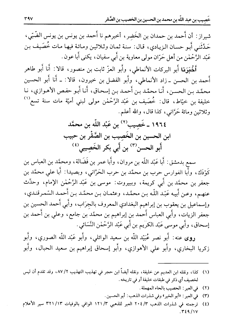 1964 - خصيب (2) بن عبد الله بن محمد ابن الحسين بن الخصيب بن الصقر بن حبيب أبو الحسن (3) بن أبي بكر الخصيبي (4) سمع بدمشق أبا عبد الله بن مروان وأبا عمر بن فضالة ومحمد بن العباس بن كودك وأبا الفوارس حرب بن محمد بن حرب الحراني وبصيدا أبا علي محمد بن جعفر بن محمد بن أبي كريمة وببيروت موسى بن عبد الرحمن الإمام وحدث عنهم وعن أبيه عبد الله بن محمد وعثمان بن محمد بن أحمد السمرقندي وإسماعيل بن يعقوب بن إبراهيم البغدادي المعروف بالجراب وأبي أحمد الحسين بن جعفر الزيات وأبي العباس أحمد بن إبراهيم بن محمد بن جامع وعلي بن أحمد بن إسحاق وأبي موسى عبد الكريم بن أبي عبد الرحمن النسائي روى عنه أبو نصر عبيد الله بن سعيد الوائلي وأبو عبد الله الصوري وأبو زكريا البخاري وأبو علي الأهوازي وأبو إسحاق إبراهيم بن سعيد الحبال وأبو