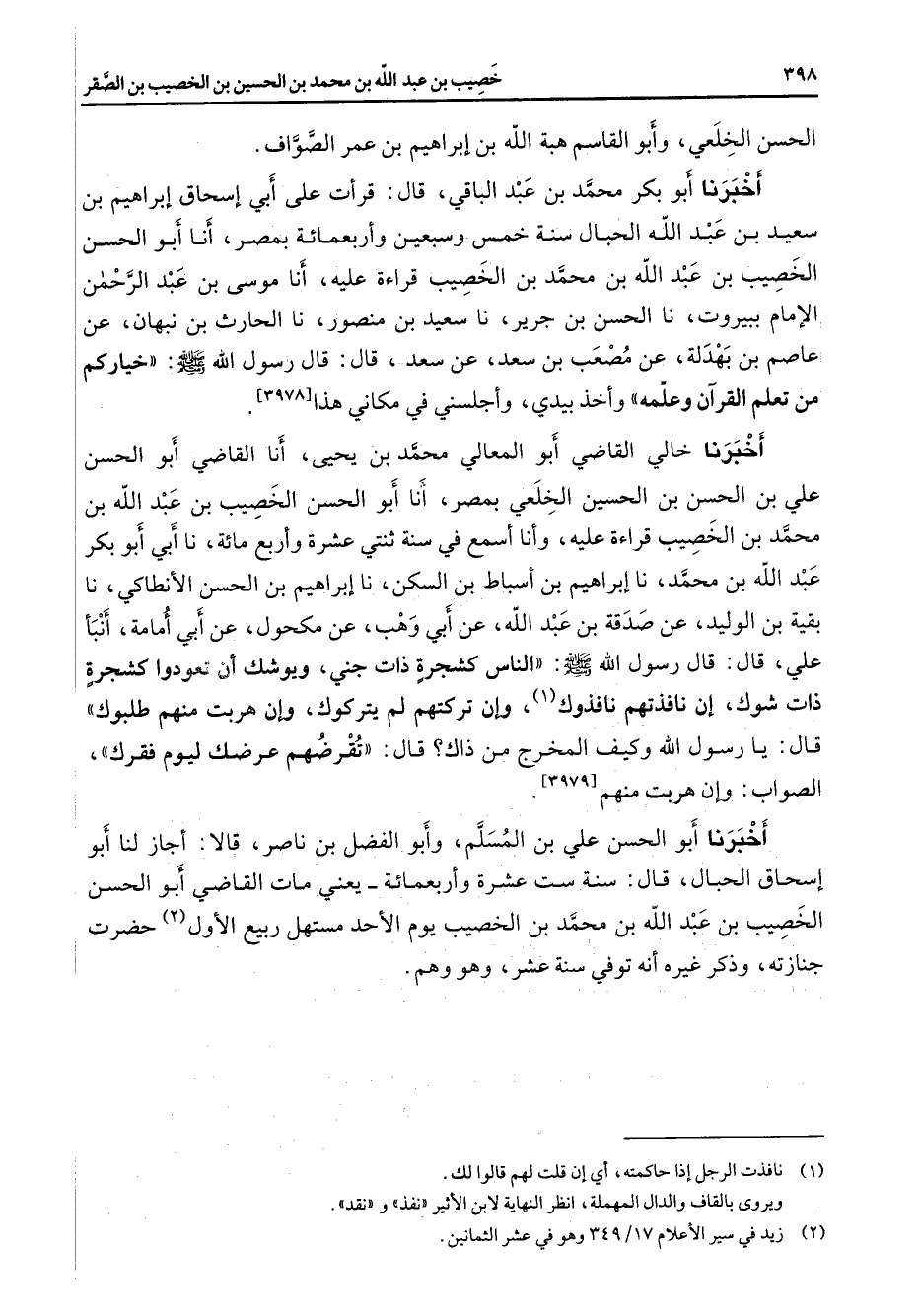الحسن الخلعي وأبو القاسم هبة الله بن إبراهيم بن عمر الصواف أخبرنا أبو بكر محمد بن عبد الباقي قال قرأت على أبي إسحاق إبراهيم بن سعيد بن عبد الله الحبال سنة خمس وسبعين وأربعمائة بمصر أنا أبو الحسن الخصيب بن عبد الله بن محمد بن الخصيب قراءة عليه أنا موسى بن عبد الرحمن الإمام ببيروت نا الحسن بن جرير نا سعيد بن منصور نا الحارث بن نبهان عن عاصم بن بهدلة عن مصعب بن سعد عن سعد قال قال رسول الله (صلى الله عليه وسلم) خياركم من تعلم القرآن وعلمه وأخذ بيدي وأجلسني في مكاني هذا أخبرنا خالي القاضي أبو المعالي محمد بن يحيى أنا القاضي أبو الحسن علي بن الحسن بن الحسين الخلعي بمصر أنا أبو الحسن الخصيب بن عبد الله بن محمد بن الخصيب قراءة عليه وأنا أسمع في سنة ثنتي عشرة وأربع مائة نا أبي أبو بكر عبد الله بن محمد نا إبراهيم بن أسباط بن السكن نا إبراهيم بن الحسن الأنطاكي نا بقية بن الوليد عن صدقة بن عبد الله عن أبي وهب عن مكحول عن أبي أمامة أنبأ علي قال قال رسول الله (صلى الله عليه وسلم) الناس كشجرة ذات جني ويوشك أن تعودوا كشجرة ذات شوك إن نافذتهم نافذوك (1) وإن تركتهم لم يتركوك وإن هربت منهم طلبوك قال يا رسول الله وكيف المخرج من ذاك قال تقرضهم عرضك ليوم فقرك الصواب وإن هربت منهم أخبرنا أبو الحسن علي بن المسلم وأبو الفضل بن ناصر قالا أجاز لنا أبو إسحاق الحبال قال سنة ست عشرة وأربعمائة يعني مات القاضي أبو الحسن الخصيب بن عبد الله بن محمد بن الخصيب يوم الأحد مستهل ربيع الأول (2) حضرت جنازته وذكر غيره أنه توفي سنة عشر وهو وهم /
