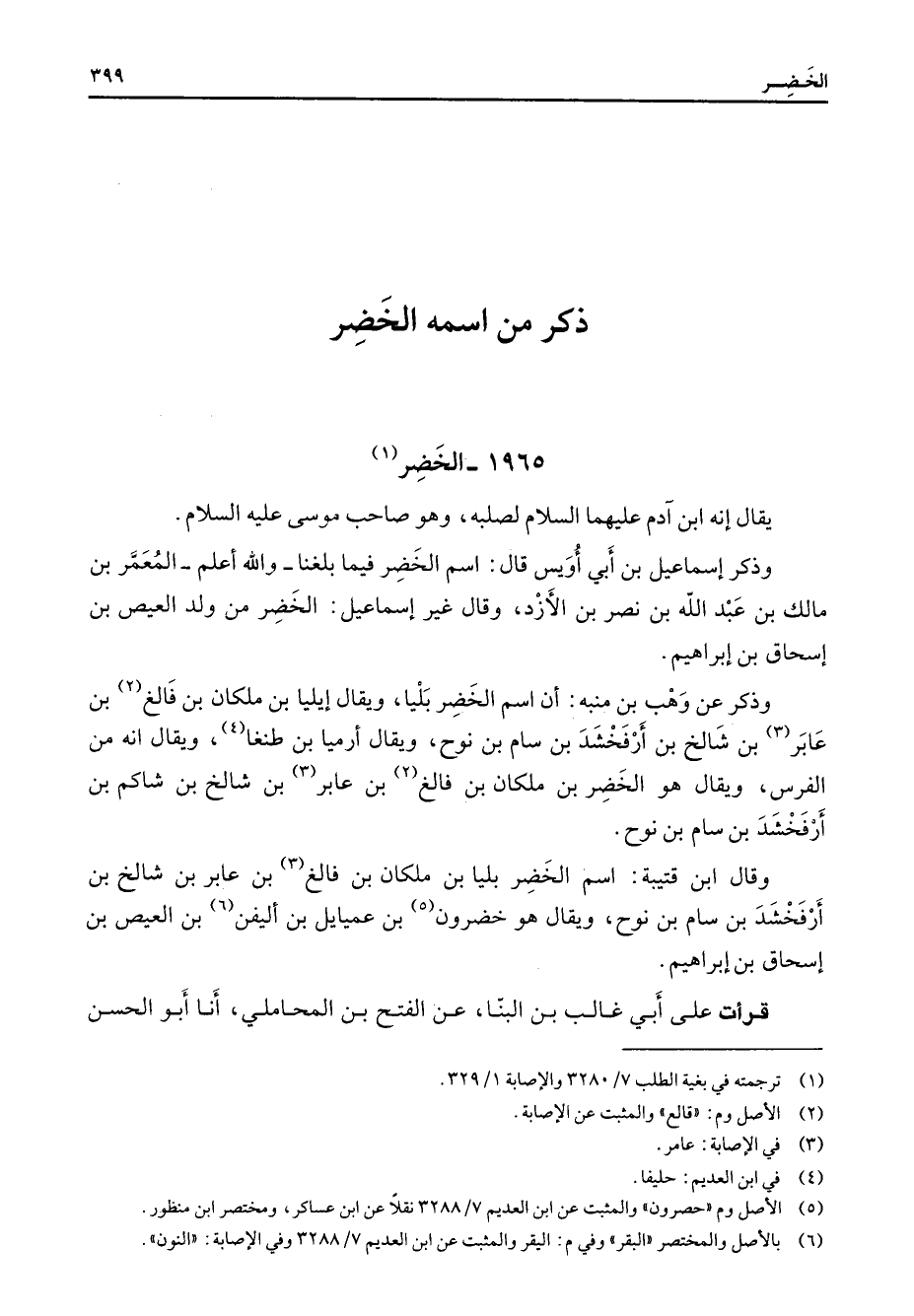 ذكر من اسمه الخضر / 1965 الخضر (1) يقال إنه ابن آدم عليهما السلام لصلبه وهو صاحب موسى عليه السلام وذكر إسماعيل بن أبي أويس قال اسم الخضر فيما بلغنا والله أعلم المعمر بن مالك بن عبد الله بن نصر بن الأزد وقال غير إسماعيل الخضر من ولد العيص بن إسحاق بن إبراهيم وذكر عن وهب بن منبه أن اسم الخضر بليا ويقال إيليا بن ملكان بن فالغ (2) بن عابر (3) بن شالخ بن أرفخشد بن سام بن نوح ويقال أرميا بن طنغا (4) ويقال إنه من الفرس ويقال هو الخضر بن ملكان بن فالغ (2) بن عابر (3) بن شالخ بن شاكم بن أرفخشد بن سام بن نوح وقال ابن قتيبة اسم الخضر بليا بن ملكان بن فالغ (3) بن عابر بن شالخ بن أرفخشد بن سام بن نوح ويقال هو خضرون (5) بن عميايل بن أليفن (6) بن العيص بن إسحاق بن إبراهيم قرأت على أبي غالب بن البنا عن الفتح بن المحاملي أنا أبو الحسن