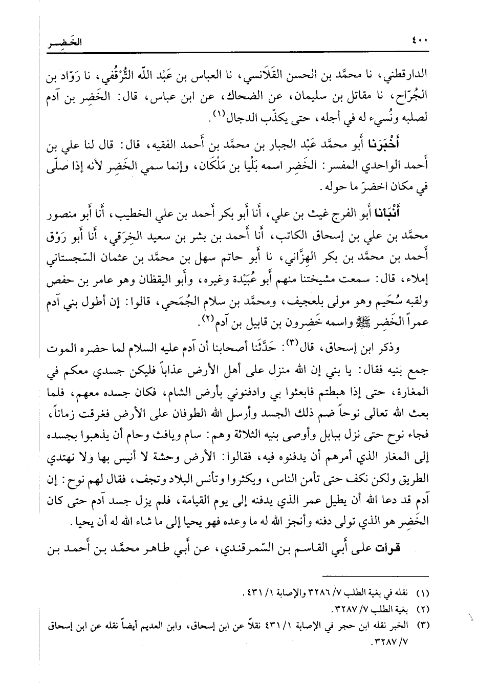 الدارقطني نا محمد بن الحسن القلانسي نا العباس بن عبد الله الترقفي نا رواد بن الجراح نا مقاتل بن سليمان عن الضحاك عن ابن عباس قال الخضر بن آدم لصلبه ونسئ له في أجله حتى يكذب الدجال (1) أخبرنا أبو محمد عبد الجبار بن محمد بن أحمد الفقيه قال قال لنا علي بن أحمد الواحدي المفسر الخضر اسمه بليا بن ملكان وإنما سمي الخضر لأنه إذا صلى في مكان اخضر ما حوله أنبأنا أبو الفرج غيث بن علي أنا أبو بكر أحمد بن علي الخطيب أنا أبو منصور محمد بن علي بن إسحاق الكاتب أنا أحمد بن بشر بن سعيد الخرقي أنا أبو روق أحمد بن محمد بن بكر الهزاني نا أبو حاتم سهل بن محمد بن عثمان السجستاني إملاء قال سمعت مشيختنا منهم أبو عبيدة وغيره وأبو اليقظان وهو عامر بن حفص ولقبه سحيم وهو مولى بلعجيف ومحمد بن سلام الجمحي قالوا إن أطول بني آدم عمرا الخضر (صلى الله عليه وسلم) واسمه خضرون بن قابيل بن آدم (2) وذكر ابن إسحاق قال (3) حدثنا أصحابنا أن آدم عليه السلام لما حضره الموت جمع بنيه فقال يا بني إن الله منزل على أهل الأرض عذابا فليكن جسدي معكم في المغارة حتى إذا هبطتم فابعثوا بي وادفنوني بأرض الشام فكان جسده معهم فلما بعث الله تعالى نوحا ضم ذلك الجسد وأرسل الله الطوفان على الأرض فغرقت زمانا فجاء نوح حتى نزل ببابل وأوصى بنيه الثلاثة وهم سام ويافث وحام أن يذهبوا بجسده إلى المغار الذي أمرهم أن يدفنوه فيه فقالوا الأرض وحشة لا أنيس بها ولا نهتدي الطريق ولكن نكف حتى تأمن الناس ويكثروا وتأنس البلاد وتجف فقال لهم نوح إن آدم قد دعا الله أن يطيل عمر الذي يدفنه إلى يوم القيامة فلم يزل جسد آدم حتى كان الخضر هو الذي تولى دفنه وأنجز الله له ما وعده فهو يحيا إلى ما شاء الله له أن يحيا قرأت على أبي القاسم بن السمرقندي عن أبي طاهر محمد بن أحمد بن