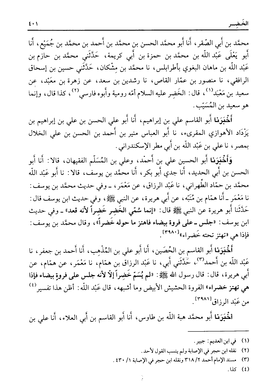 محمد بن أبي الصقر أنا أبو محمد الحسن بن محمد بن أحمد بن محمد بن جميع أنا أبو يعلى عبد الله بن محمد بن حمزة بن أبي كريمة حدثني محمد بن حازم بن عبد الله بن ماهان البغوي بأطرابلس نا محمد بن مشكان حدثني حسين بن إسحاق الرافقي نا منصور بن عمار القاص نا رشدين بن سعد عن زهرة بن معبد عن سعيد بن معبد (1) قال الخضر عليه السلام أمه رومية وأبوه فارسي (2) كذا قال وإنما هو سعيد بن المسيب أخبرنا أبو القاسم علي بن إبراهيم أنا أبو علي الحسن بن علي بن إبراهيم بن يزداد الأهوازي المقرئ نا أبو العباس منير بن أحمد بن الحسن بن علي الخلال بمصر نا علي بن عبد الله بن أبي مطر الإسكندراني وأخبرنا أبو الحسين علي بن أحمد وعلي بن المسلم الفقيهان قالا أنا أبو الحسن بن أبي الحديد أنا جدي أبو بكر أنا محمد بن يوسف قالا نا أبو عبد الله محمد بن حماد الطهراني نا عبد الرزاق عن معمر وفي حديث محمد بن يوسف نا معمر أنا همام بن منبه عن أبي هريرة عن النبي (صلى الله عليه وسلم) وفي حديث ابن يوسف قال حدثنا أبو هريرة عن النبي (صلى الله عليه وسلم) قال إنما سمي الخضر خضرا لأنه قعد وفي حديث ابن يوسف جلس على فروة بيضاء فاهتز ما حوله خضرا وقال محمد بن يوسف فإذا هي تهتز تحته خضراء أخبرنا أبو القاسم بن حصين أنا أبو علي بن المذهب أنا أحمد بن جعفر نا عبد الله بن أحمد (3) حدثني أبي نا عبد الرزاق بن همام نا معمر عن همام عن أبي هريرة قال قال رسول الله (صلى الله عليه وسلم) لم يسم خضرا إلا لأنه جلس على فروة بيضاء فإذا هي تهتز خضراء الفروة الحشيش الأبيض وما أشبهه قال عبد الله أظن هذا تفسير (4) من عبد الرزاق أخبرنا أبو محمد هبة الله بن طاوس أنا أبو القاسم بن أبي العلاء أنا علي بن